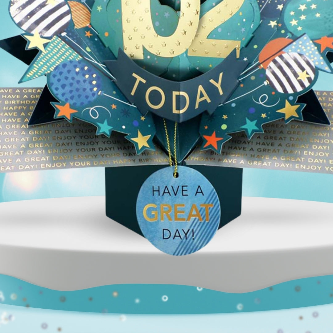 Details: This vibrant pop up card, part of the Second Nature Pop Ups range, features a lively display of colourful green and blue balloons. Featuring a bold "Happy Birthday" message and the age in large numbers, it’s the perfect way to bring a burst of excitement to any birthday celebration.