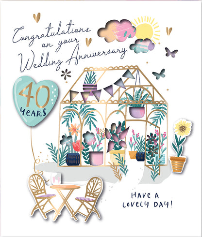 Looking for ways to celebrate a special couple's 40th wedding anniversary? Raise a glass and toast to the perfect pairing with this beautiful greenhouse themed anniversary card, complete with balloon embellishements for an added touch of luxury that this milestone deserves!
