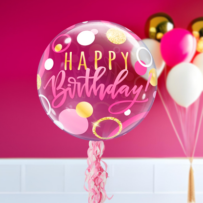 Contents: A large 16” helium-inflated bubble balloon with a ribbon and tissue paper tassel tail floats from a box filled with vibrant tissue and confetti. The balloon is anchored with a personalised pop-up card, creating the ultimate celebration surprise.