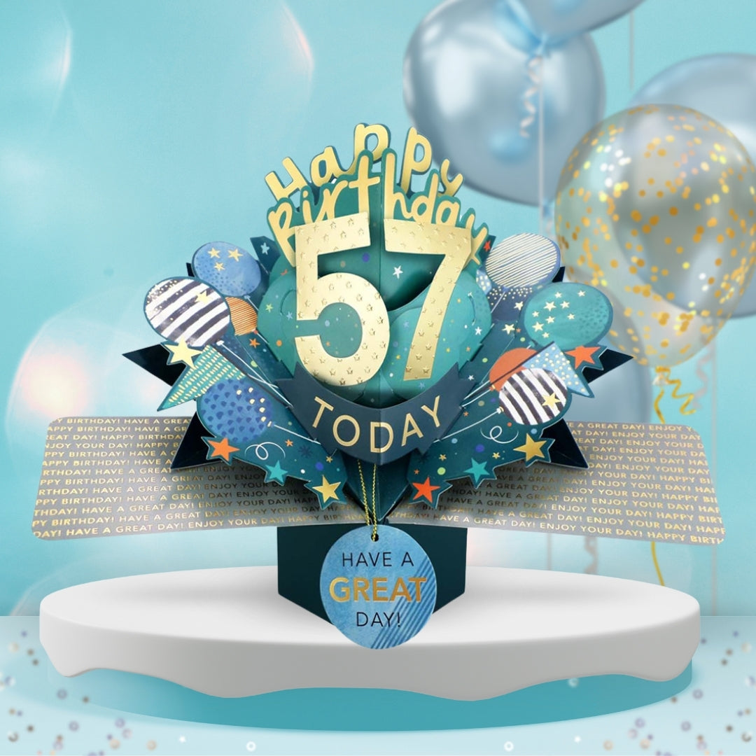Looking for a pop up birthday card for him? This exciting Balloon pop up birthday card is the perfect way to make his 57th birthday truly unforgettable! It's not just the milestone birthdays that deserve to be celebrated…this pop-up has all the WOW-factor needed to make his special day even more memorable.