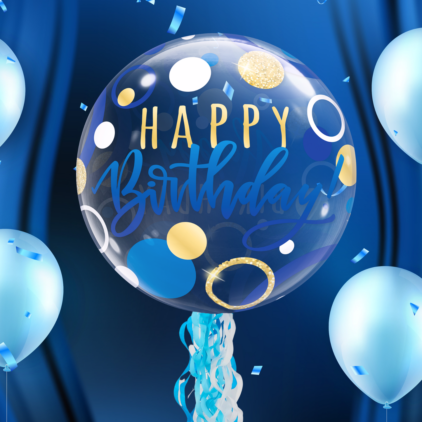Contents: A large 16” helium-inflated bubble balloon with a ribbon and tissue paper tassel tail floats from a box filled with vibrant tissue and confetti. The balloon is anchored with a personalised pop-up card, creating the ultimate celebration surprise.