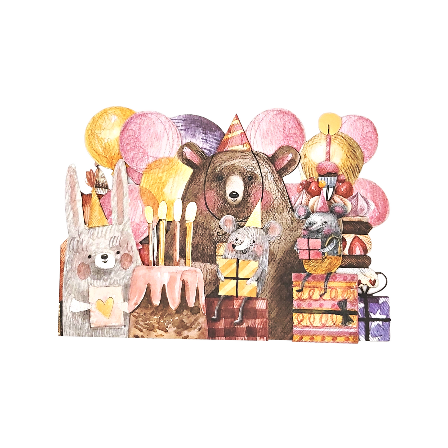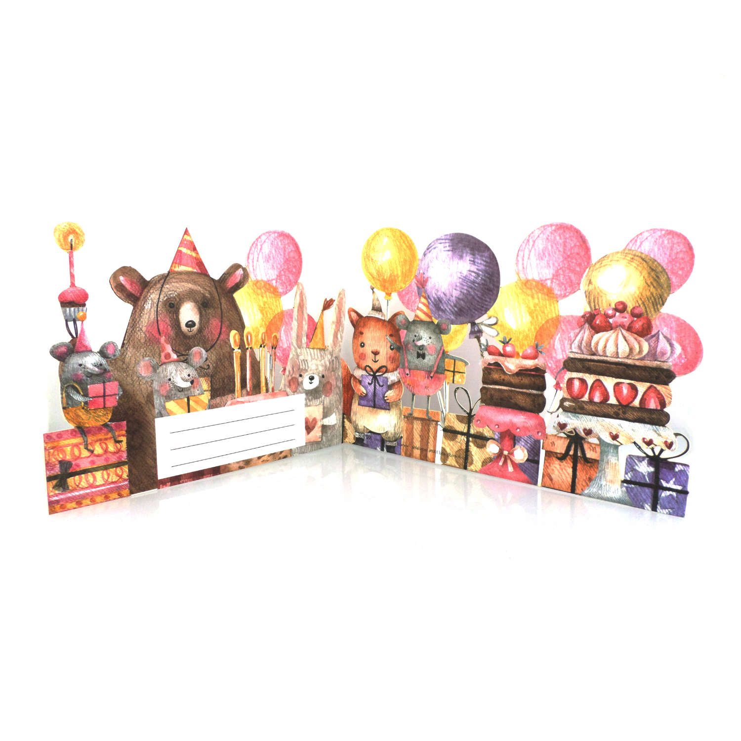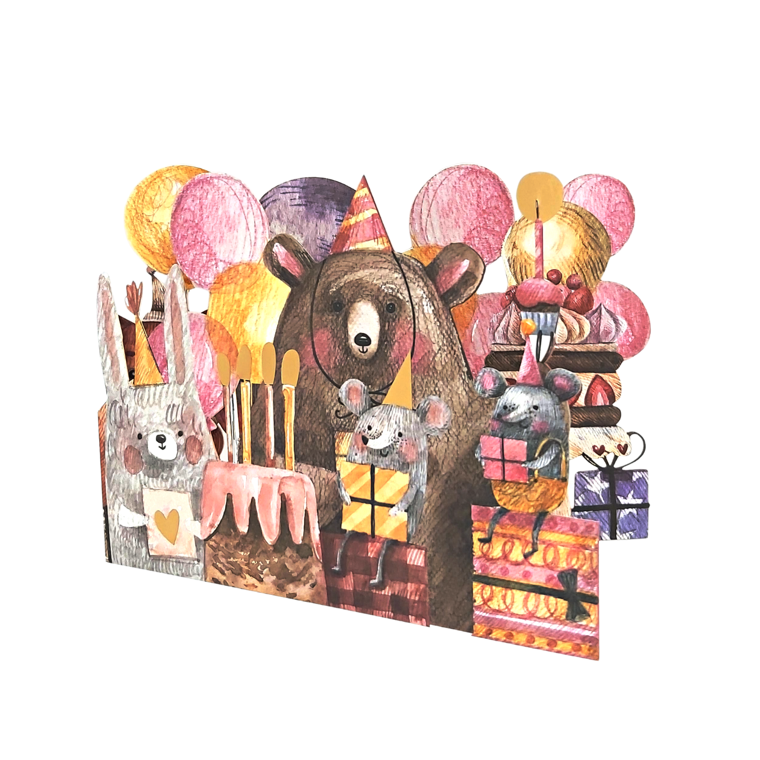 Details: A laser cut pop up greeting card with intricate cut out detailing featuring a fun design of animals at a party