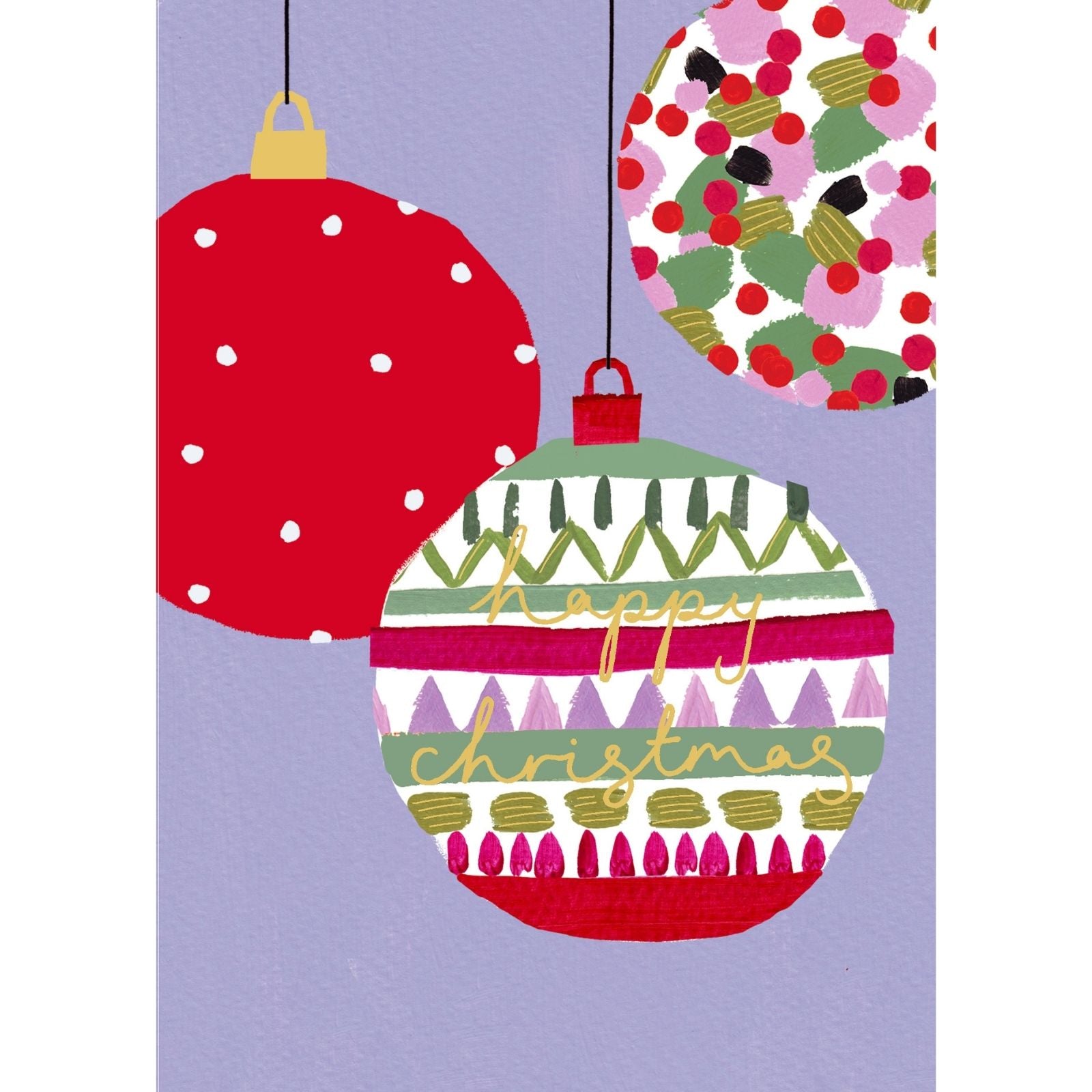 Details: This beautifully illustrated card showcases a colourful, hand-painted design with bright hanging baubles highlighted by gold foil against a lilac background. A creative and stylish choice for spreading festive cheer, featuring the caption 'Happy Christmas'.