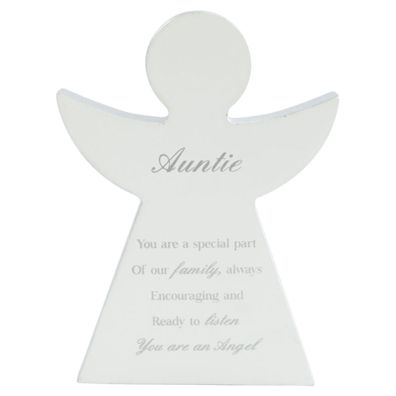 Details: A silver and white coloured freestanding wooden angel shaped block plaque