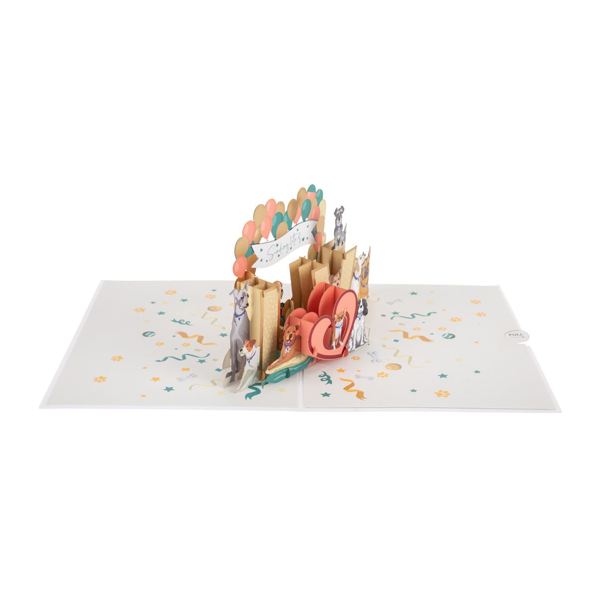 Looking for greeting card ideas for a dog lover? This playful pop up greeting card featuring cute rescue dogs will bring a heartwarming surprise to that special someone. The adorable dogs send love and joy, making it the perfect gift for any dog lover's celebration.