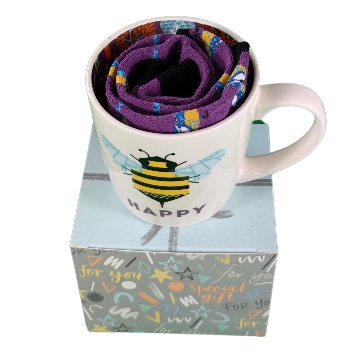 Looking for gift ideas for her? This delightful gift set captures happiness with its bee-themed mug and socks, creating a playful and positive surprise for a special someone.