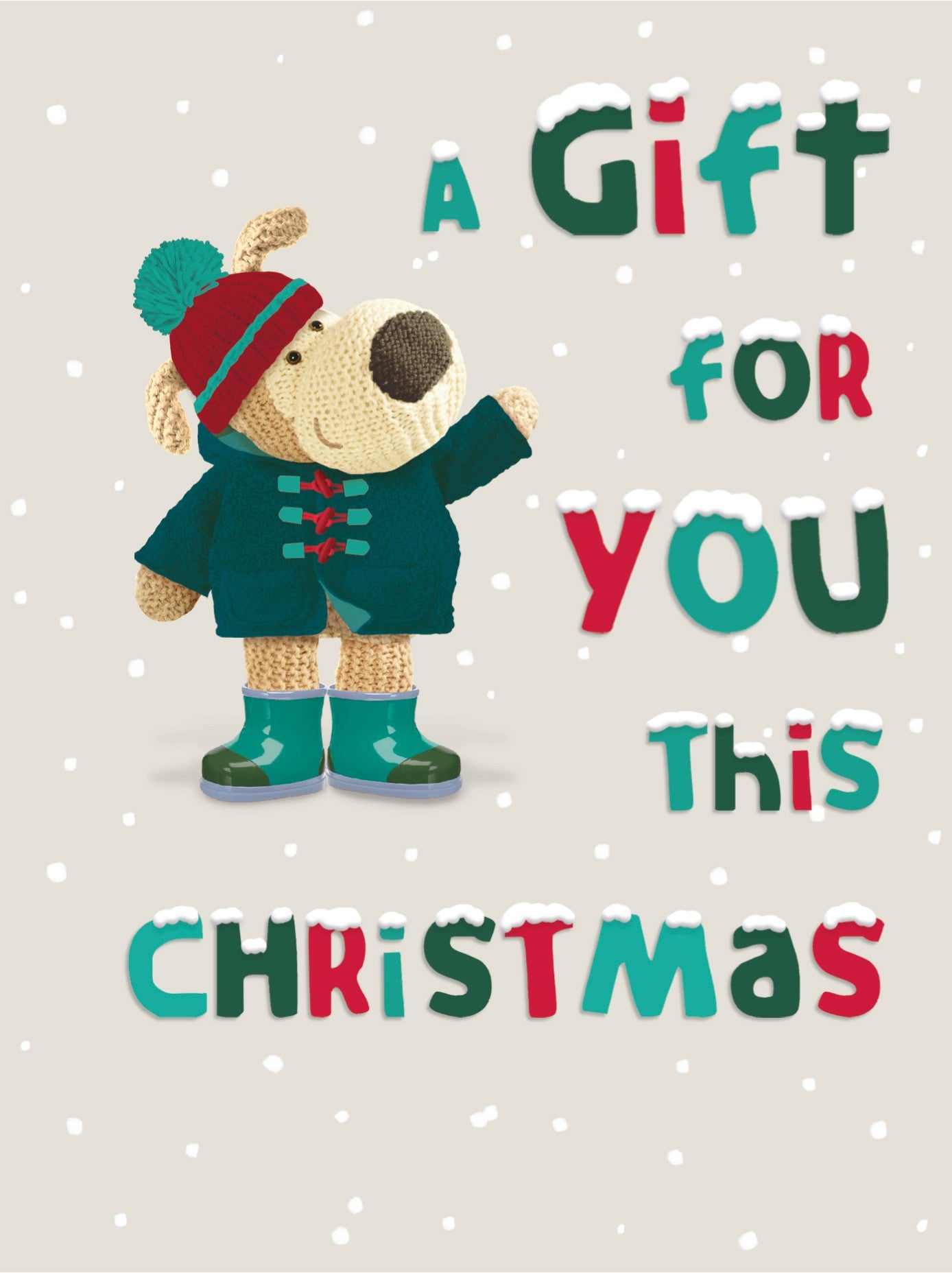 Details: This festive gift card from the Boofle range by UK Greetings features the adorable character Boofle wearing a knitted bobble hat and green welly boots in the snow with the caption 'A Gift For You This Christmas'.