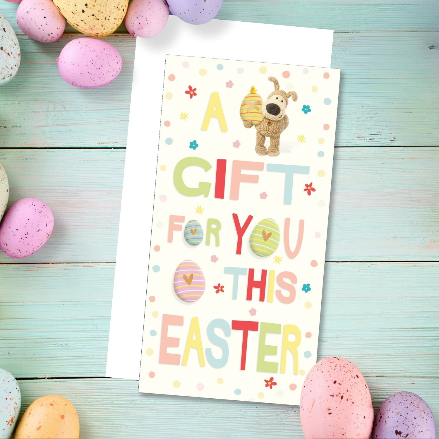 Details: This cute Boofle Easter card from the Boofle range is a thoughtful gift featuring Boofle on an egg hunt with the caption 'A GIFT FOR YOU THIS EASTER'. Perfect for making someone feel special.