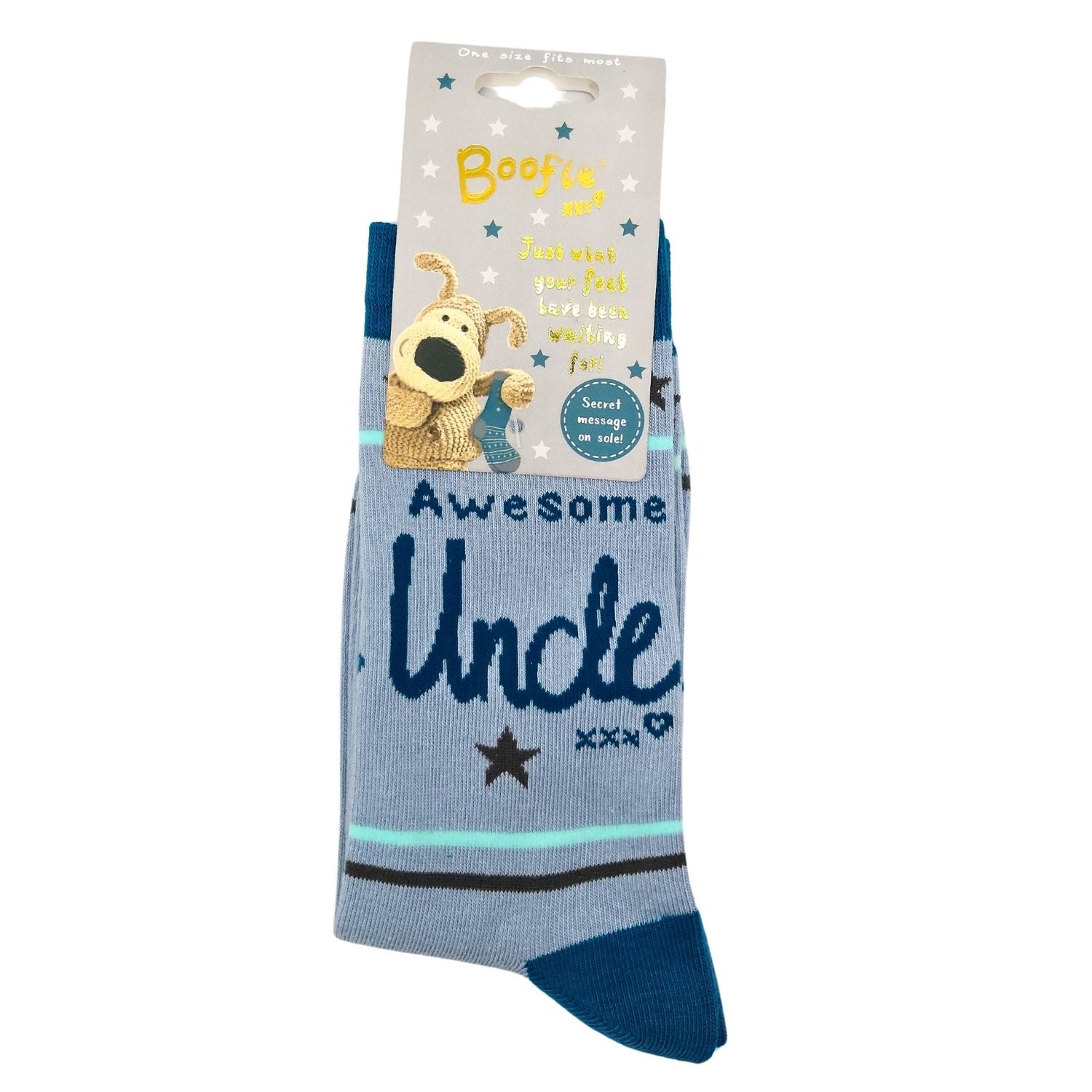 Details: Make your Uncle feel awesome with this collectable Boofle sock. Designed with blue stars and the caption 'Awesome Uncle', it's a thoughtful addition to any wardrobe. Get yours now and show your uncle how much you care!