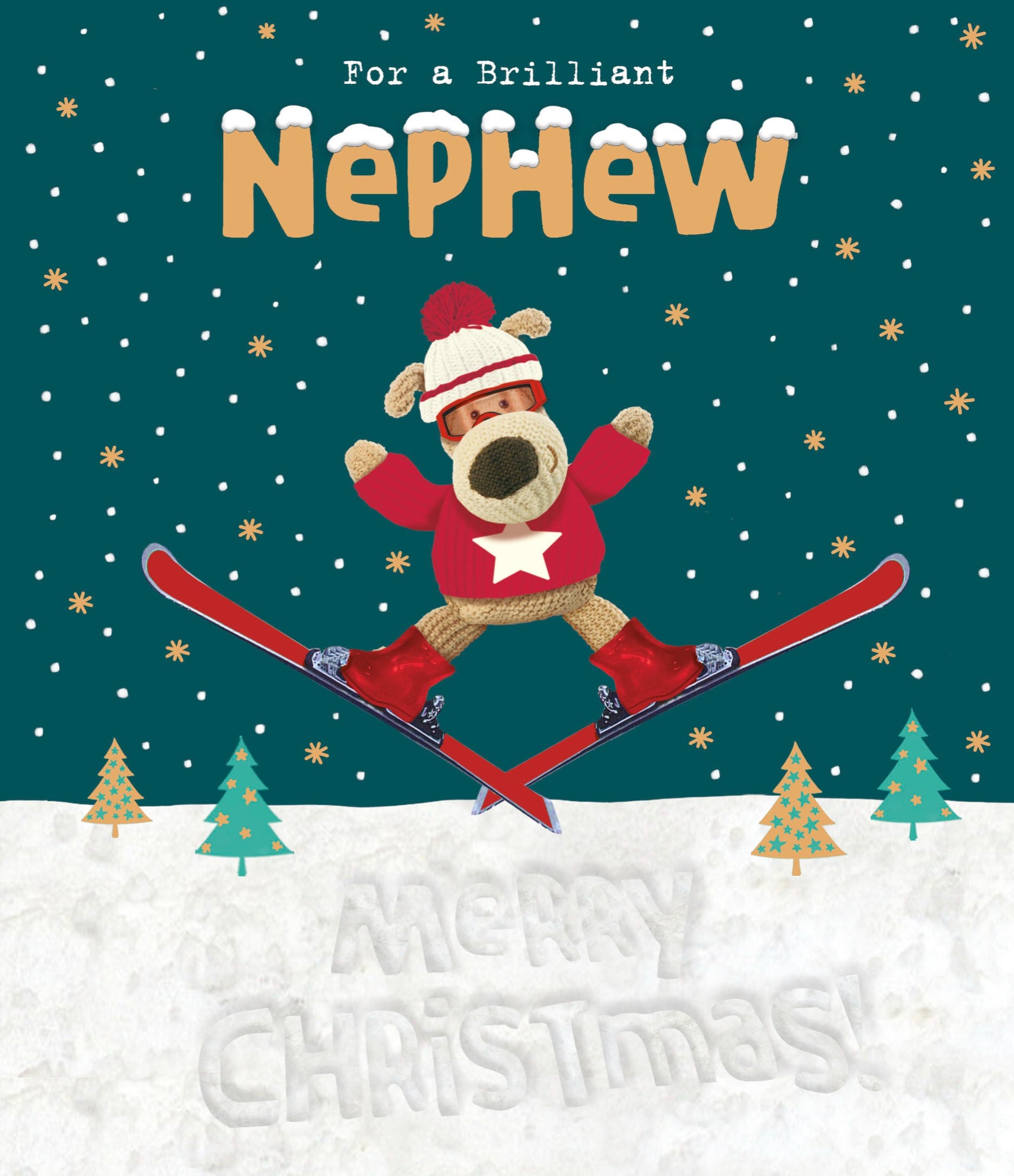 Details: This festive greeting card from UK Greetings' Boofle range showcases Boofle skiing with 'Merry Christmas' written in the snow. The caption reads 'For a Brilliant Nephew Merry Christmas!'.