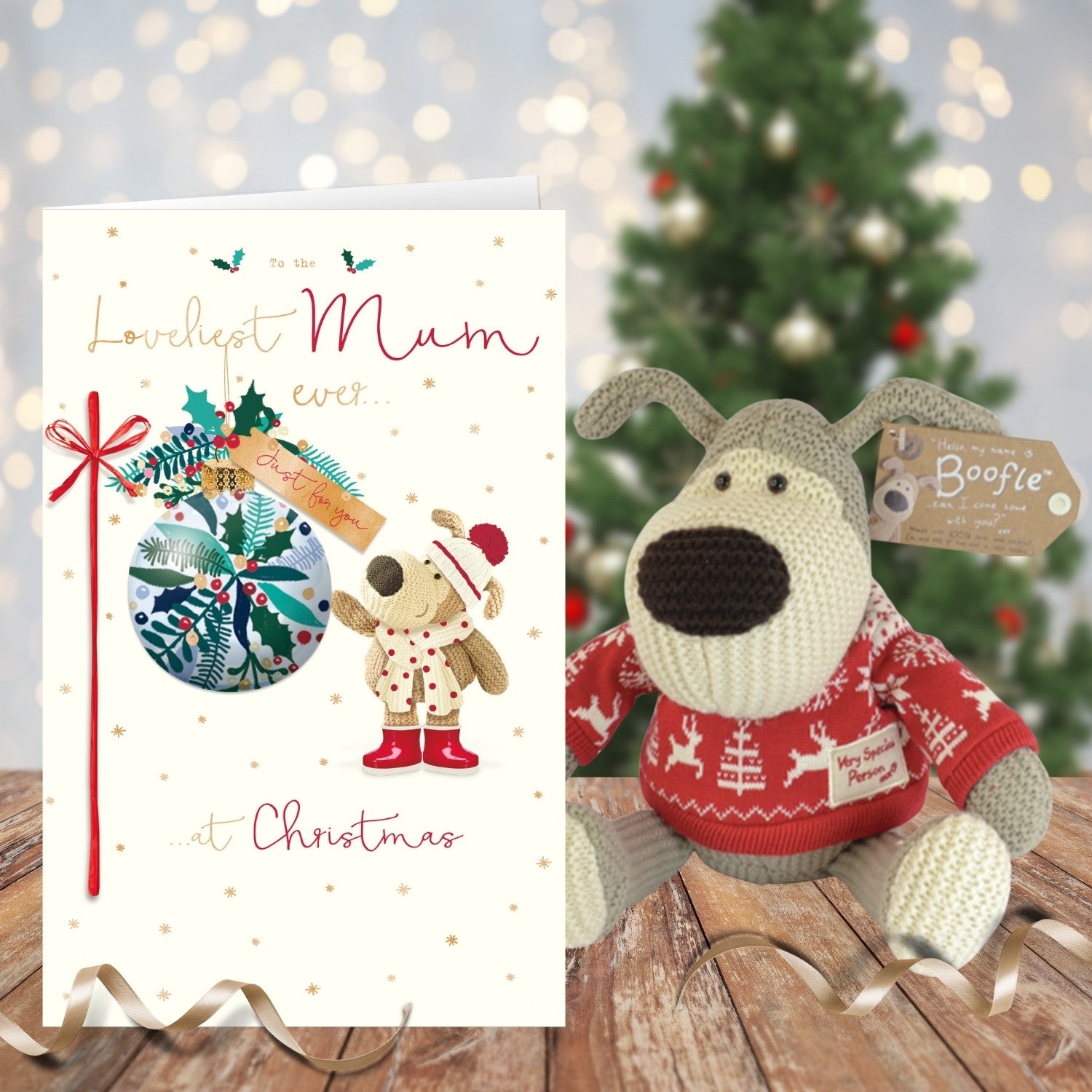 Details: This adorable Christmas greeting card is part of the Boofle range by UK Greetings. The hand-finished card features a cute Boofle reaching up to a festive decorated bauble, with the message 'To the Loveliest Mum Ever... Just for You... at Christmas'.