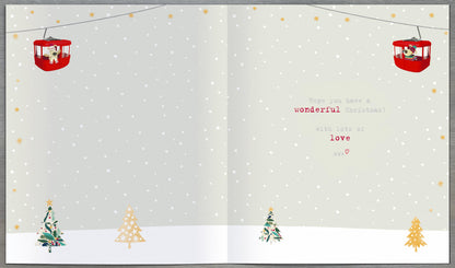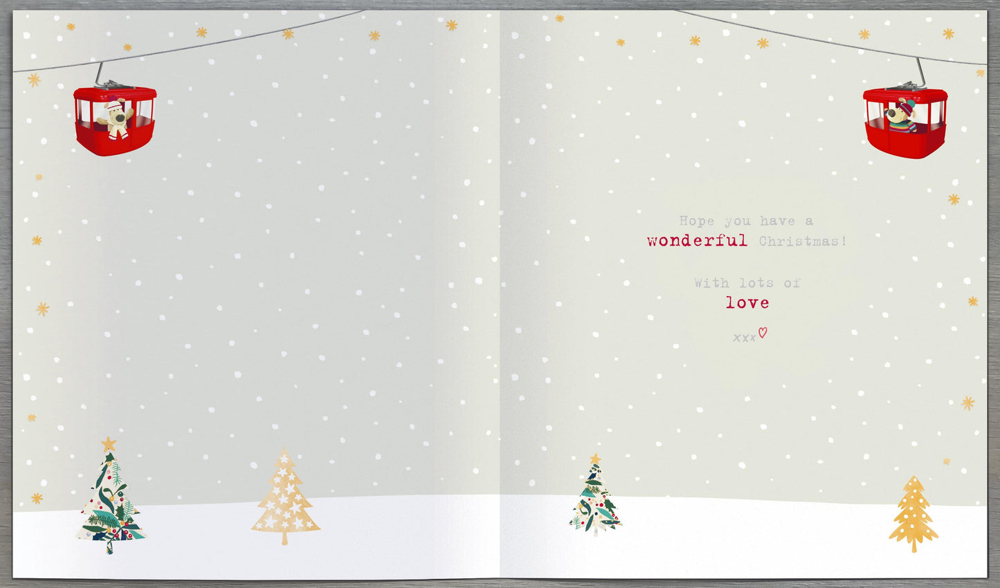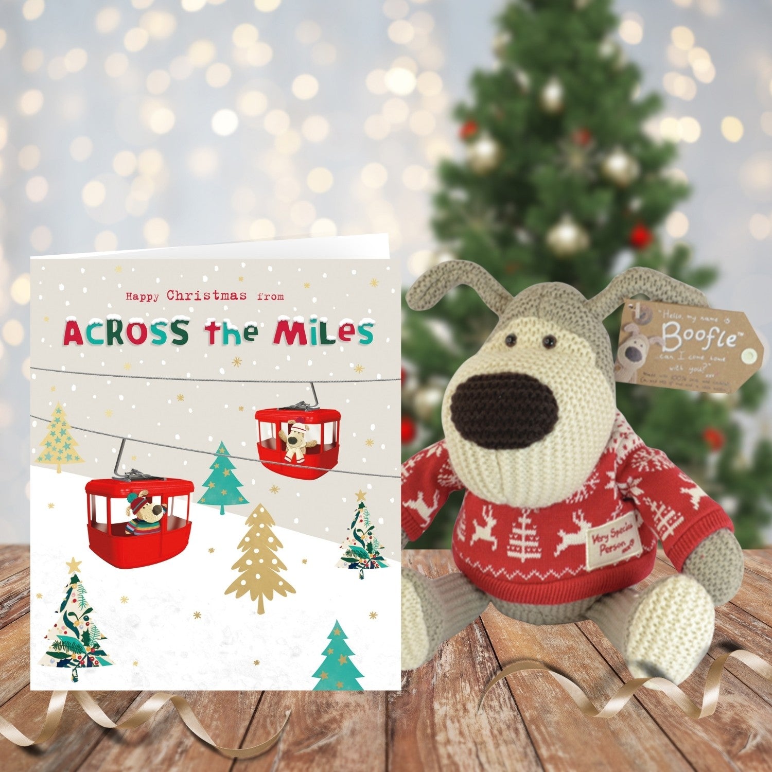 Details: This cute Christmas card has been thoughtfully designed by UK Greetings as part of their Boofle range and features Boofle smiling and waving whilst riding in a ski lift over snow and trees with the caption 'Happy Christmas from Across the Miles'.