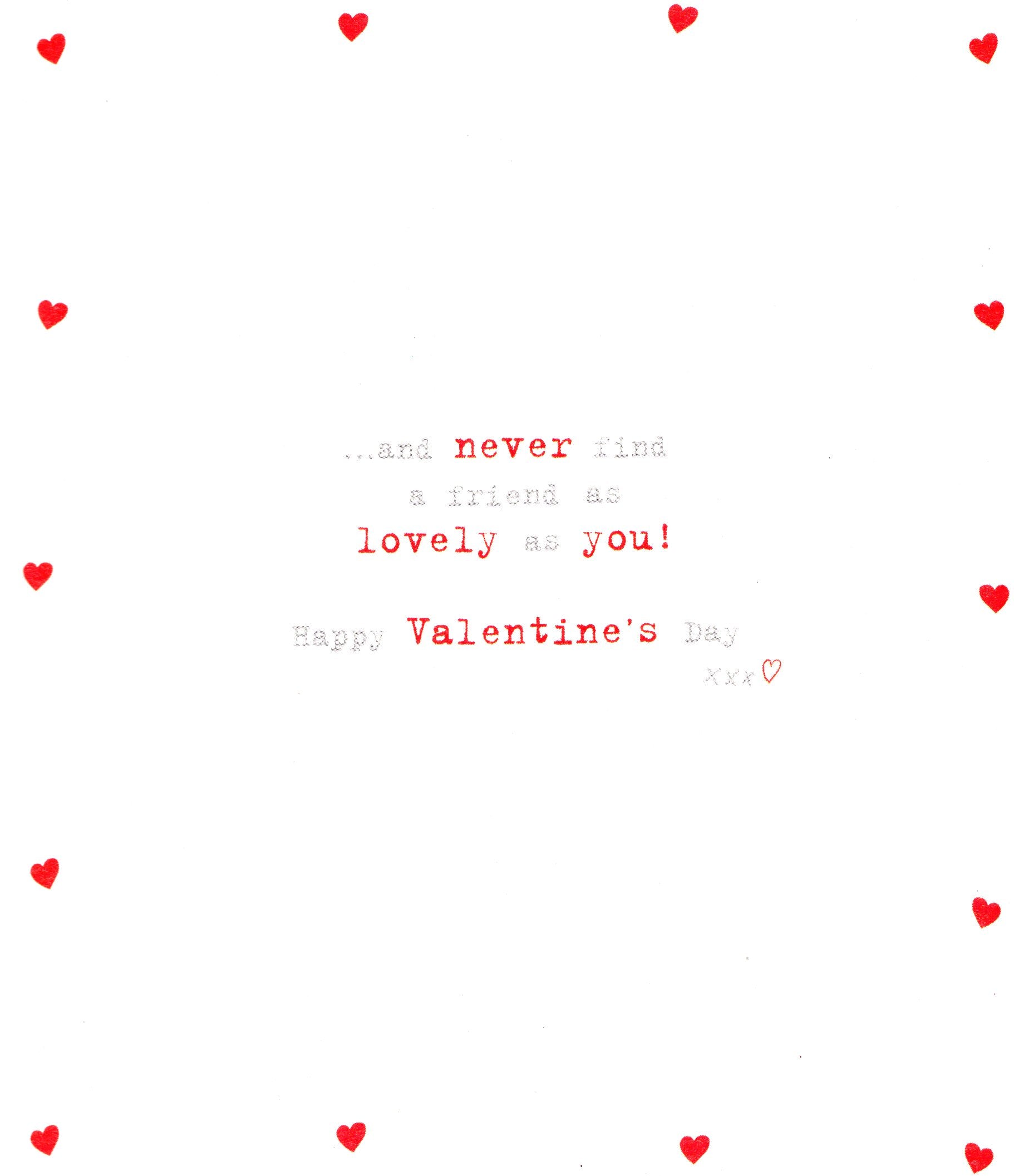 Message: To a Lovely Friend I could search and search the whole world through… …and never find a friend as lovely as you! Happy Valentine's Day xxx