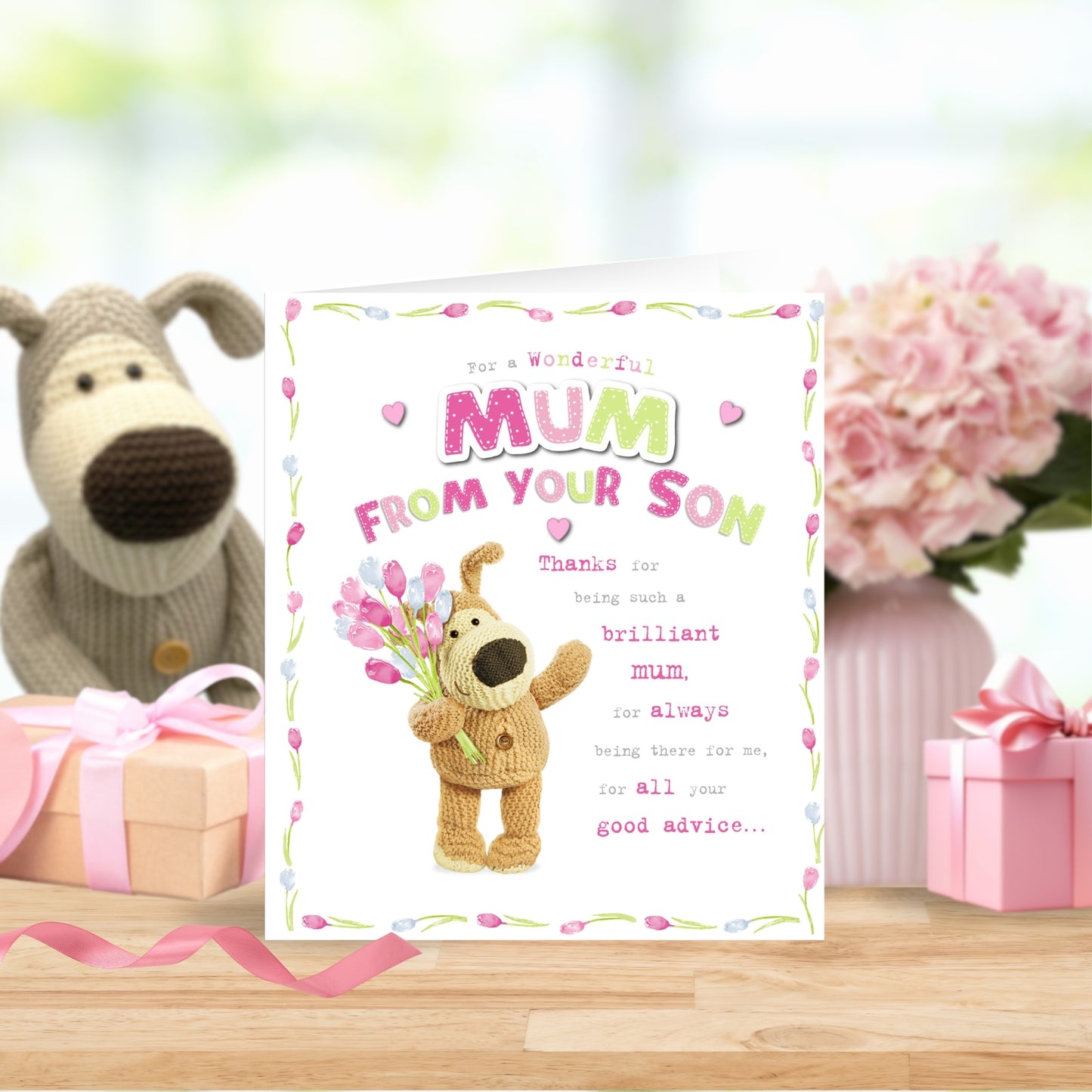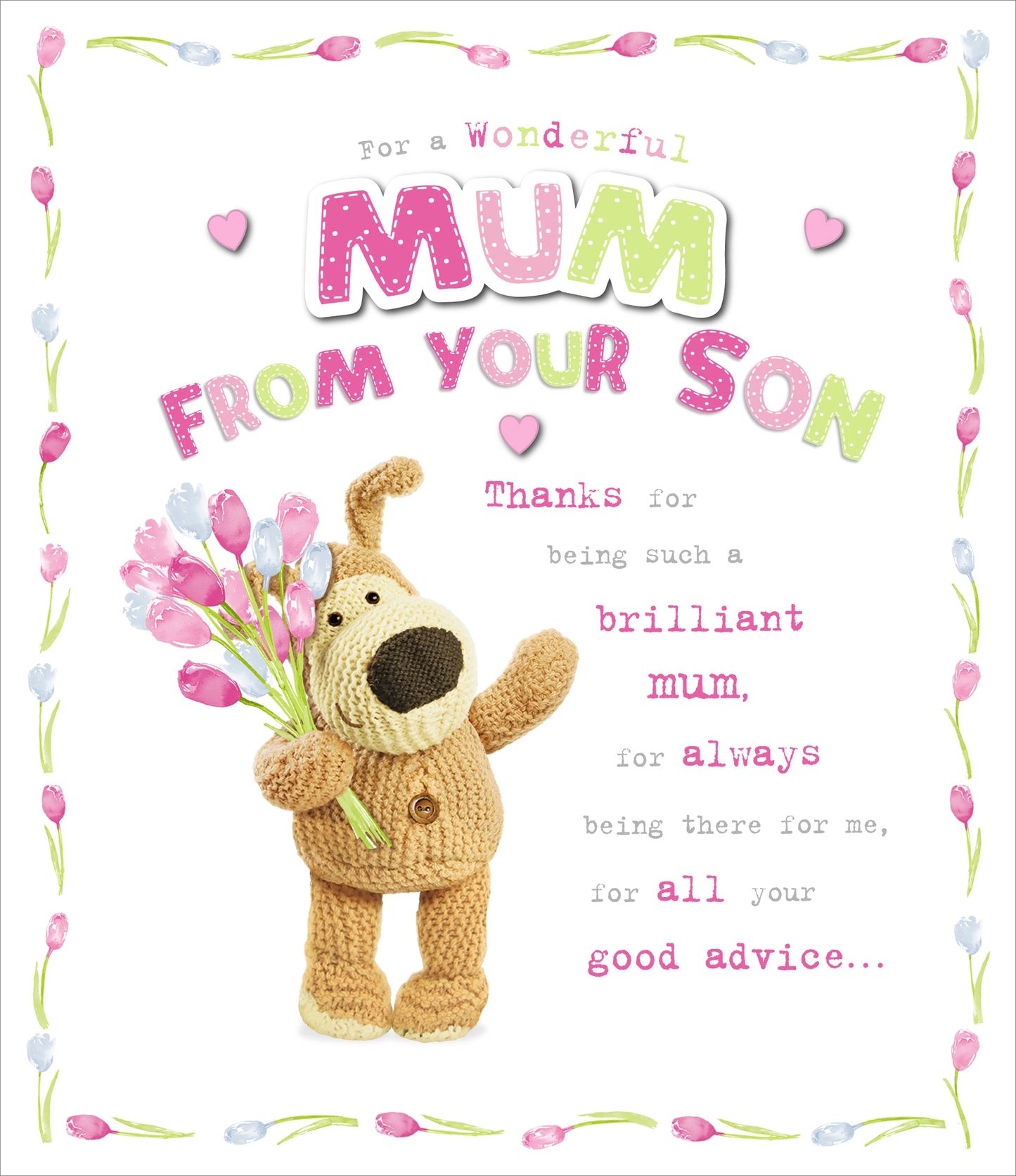 Details: A cute glitter-finished Mother's Day greeting card from your son apart of the very popular Boofle range