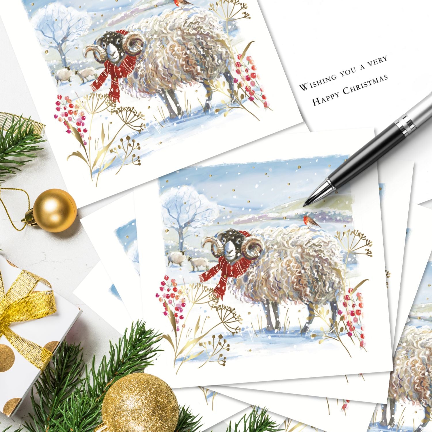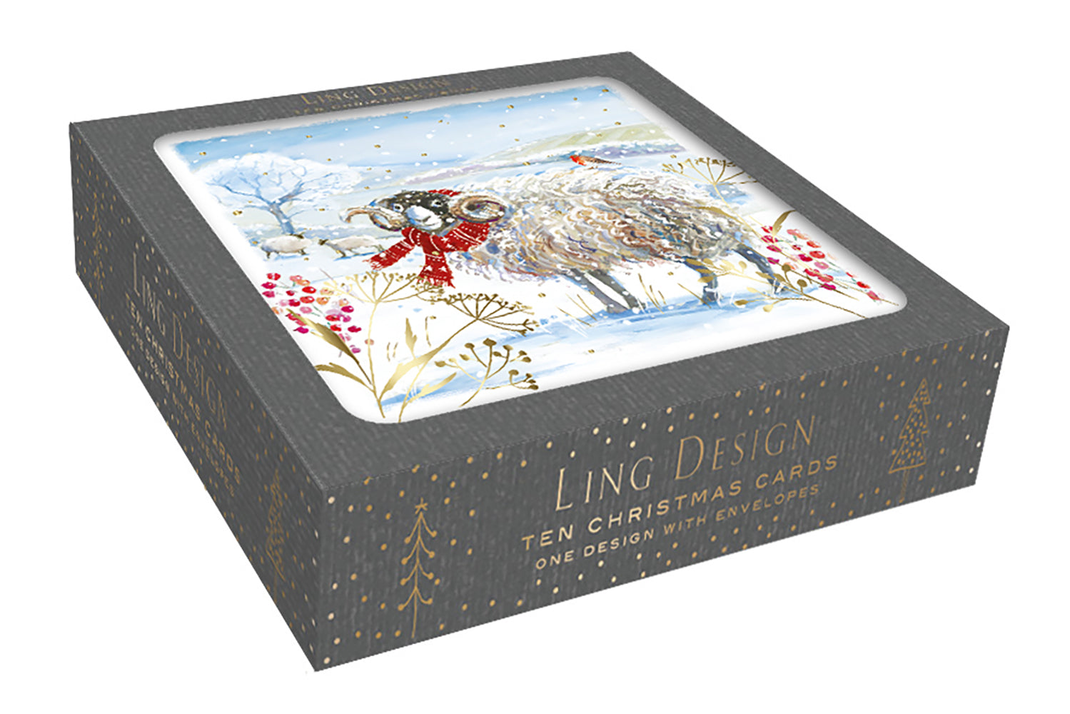 Details: Inside each box of Christmas cards are 10 cards in the same design featuring a gold foil finished ram with a robin