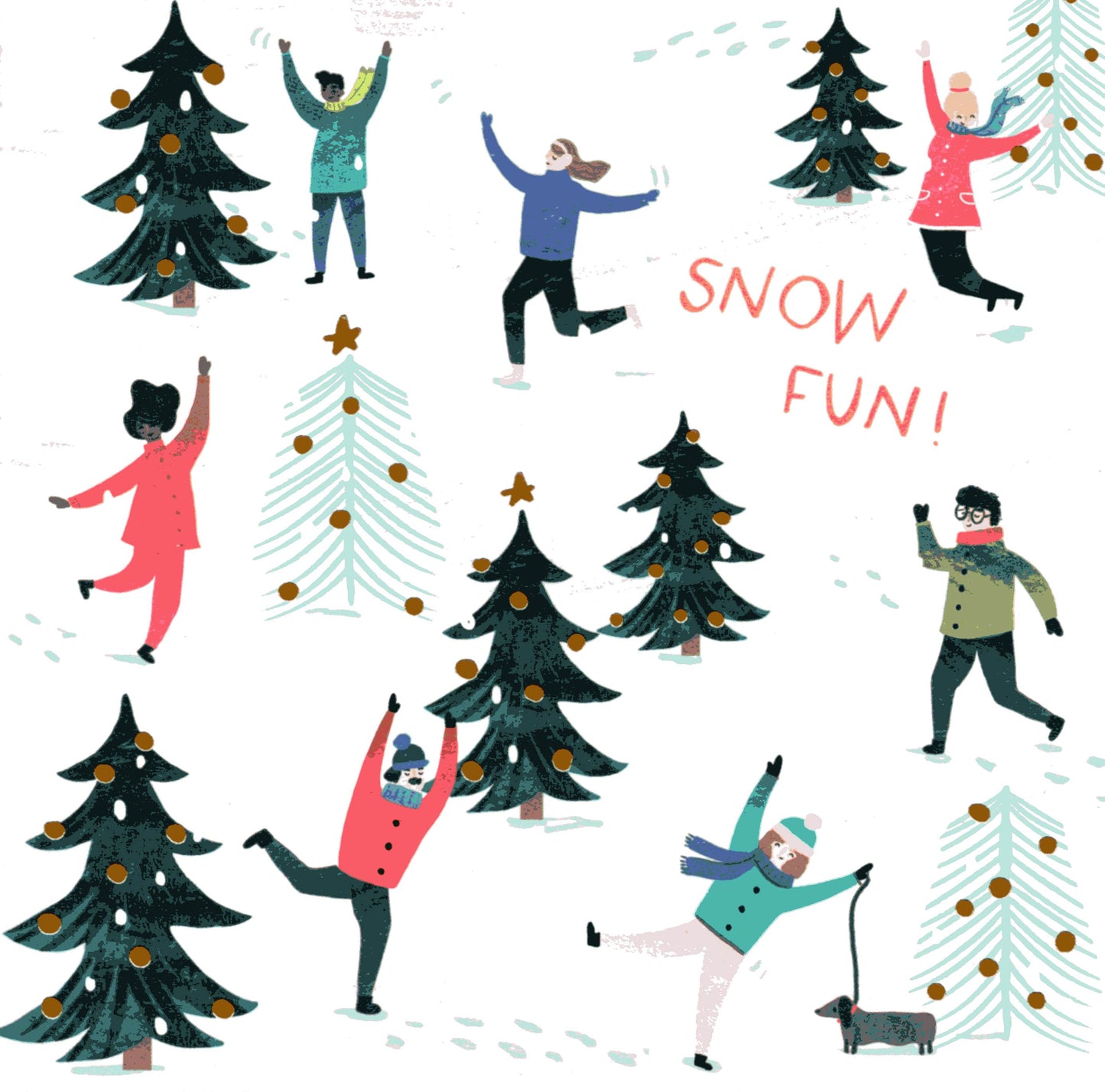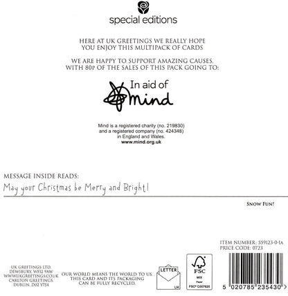 Details: This box of charitable Christmas cards features a snowy wonderland with people enjoying themselves amidst Christmas trees. The greetings 'Snow Fun!' and 'Festive Cheer' adds to the warm and joyful feeling each card conveys. For every box purchased, 80p will be donated directly to Mind, helping to support their invaluable work.