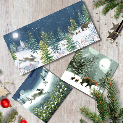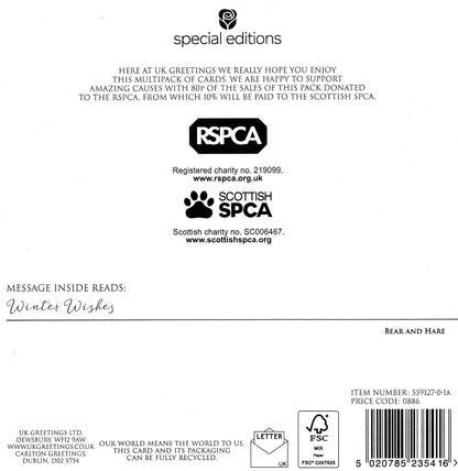 Looking for charity Christmas cards? Send heartfelt greetings with a box of magical charitable greeting cards featuring two designs of moonlit hares and bears. Surprise a special someone with this heartfelt gesture that supports the RSPCA Charity, spreading love and joy and kindness this Christmas.