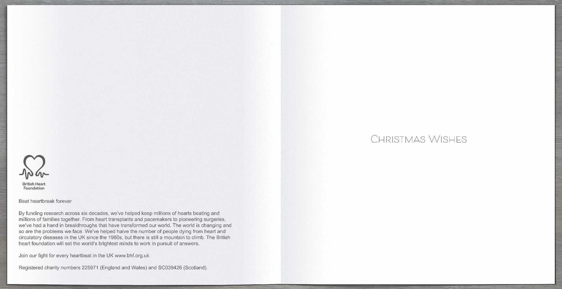 Details: Inside each box of Christmas cards are 10 cards in 2 designs and every purchase includes a charity donation of 70p per box supporting the British Heart Foundation