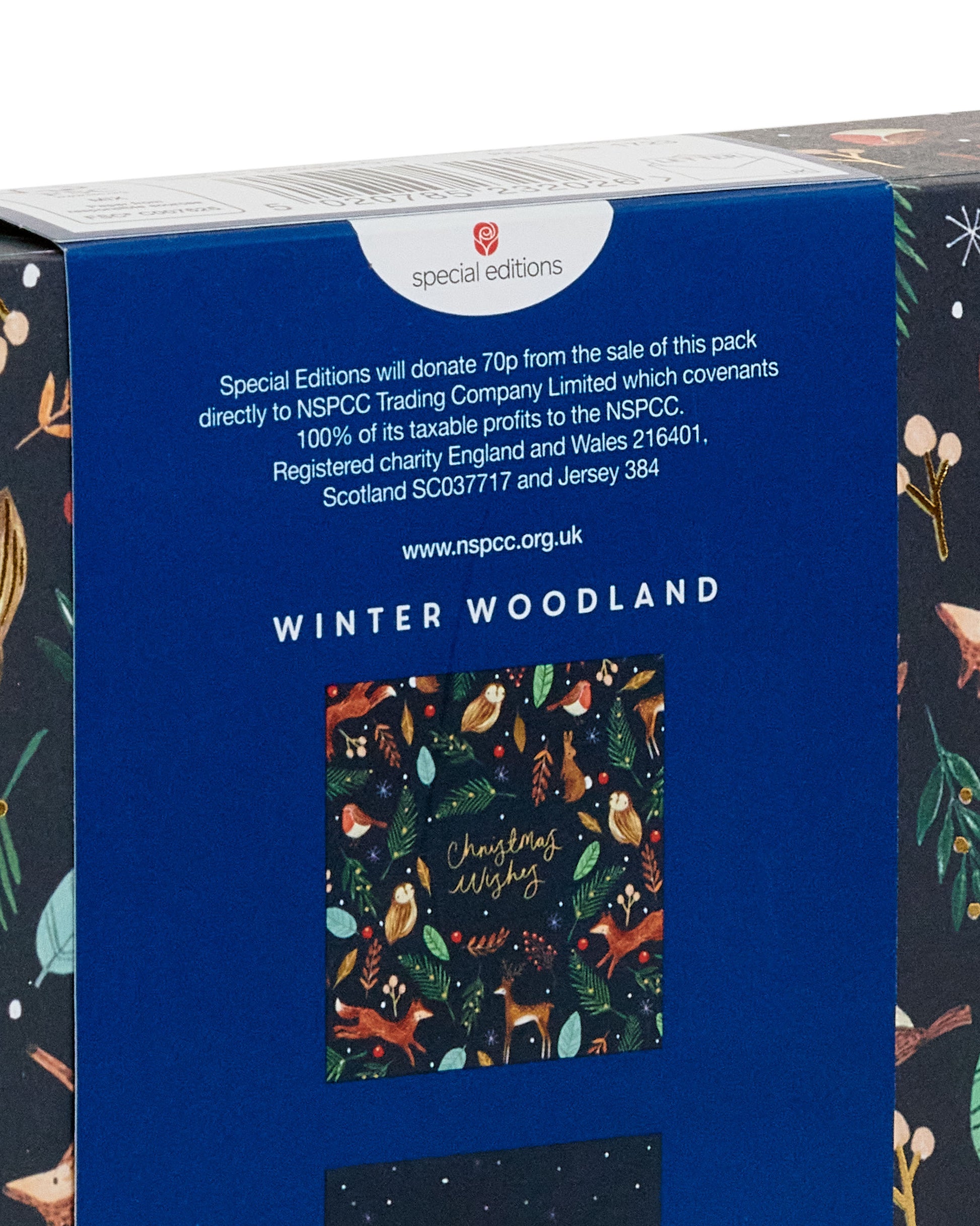Details: Inside each box of Christmas cards are 10 cards in 2 designs and every purchase includes a charity donation of 70p per box supporting the NSPCC
