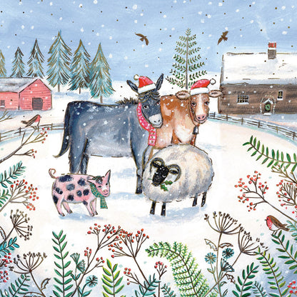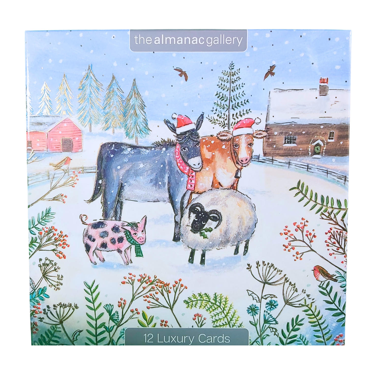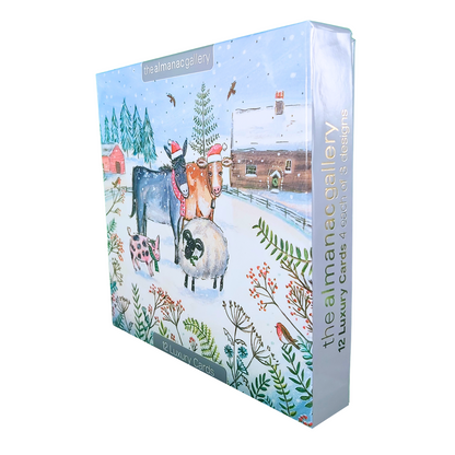 Details: Inside each box of Christmas cards are 12 luxury gold foiled cards in 3 designs featuring cows and their farmyard friends