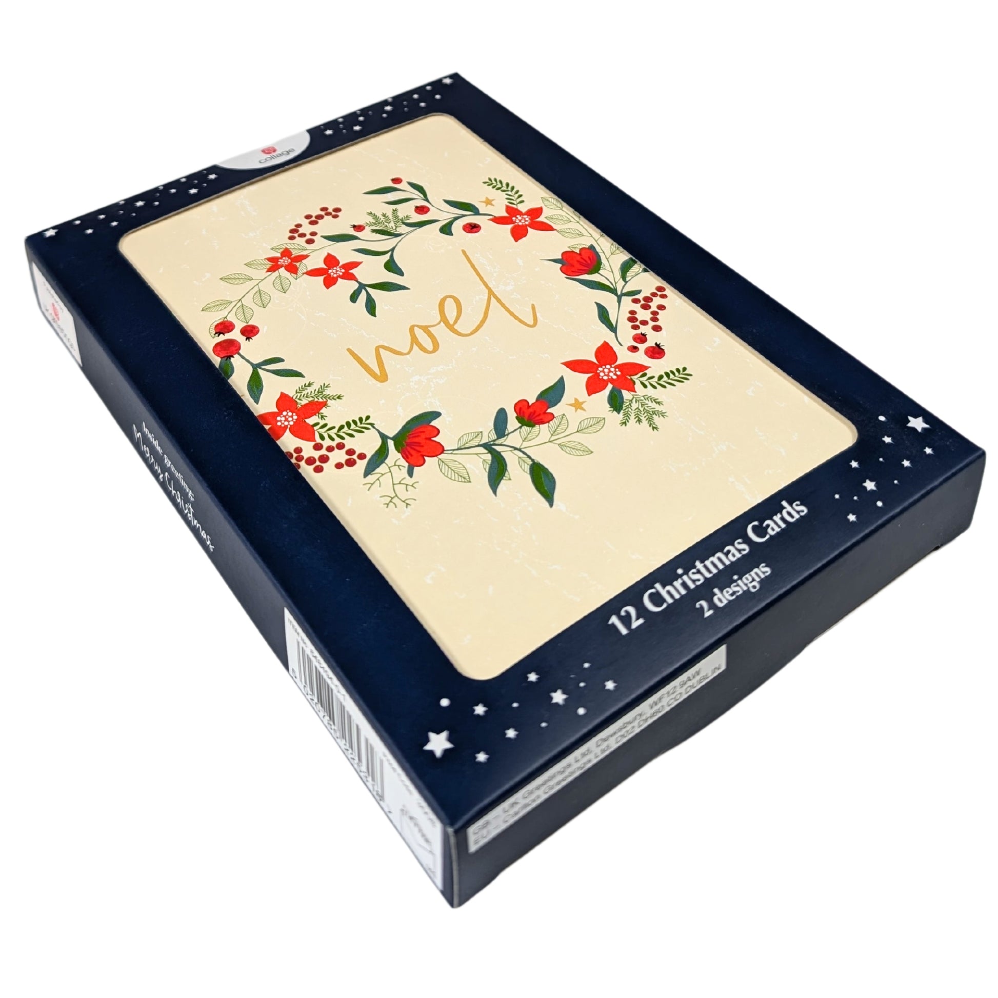 Details: A box of 12 Christmas cards in 2 designs presented in a box and complete with envelopes.