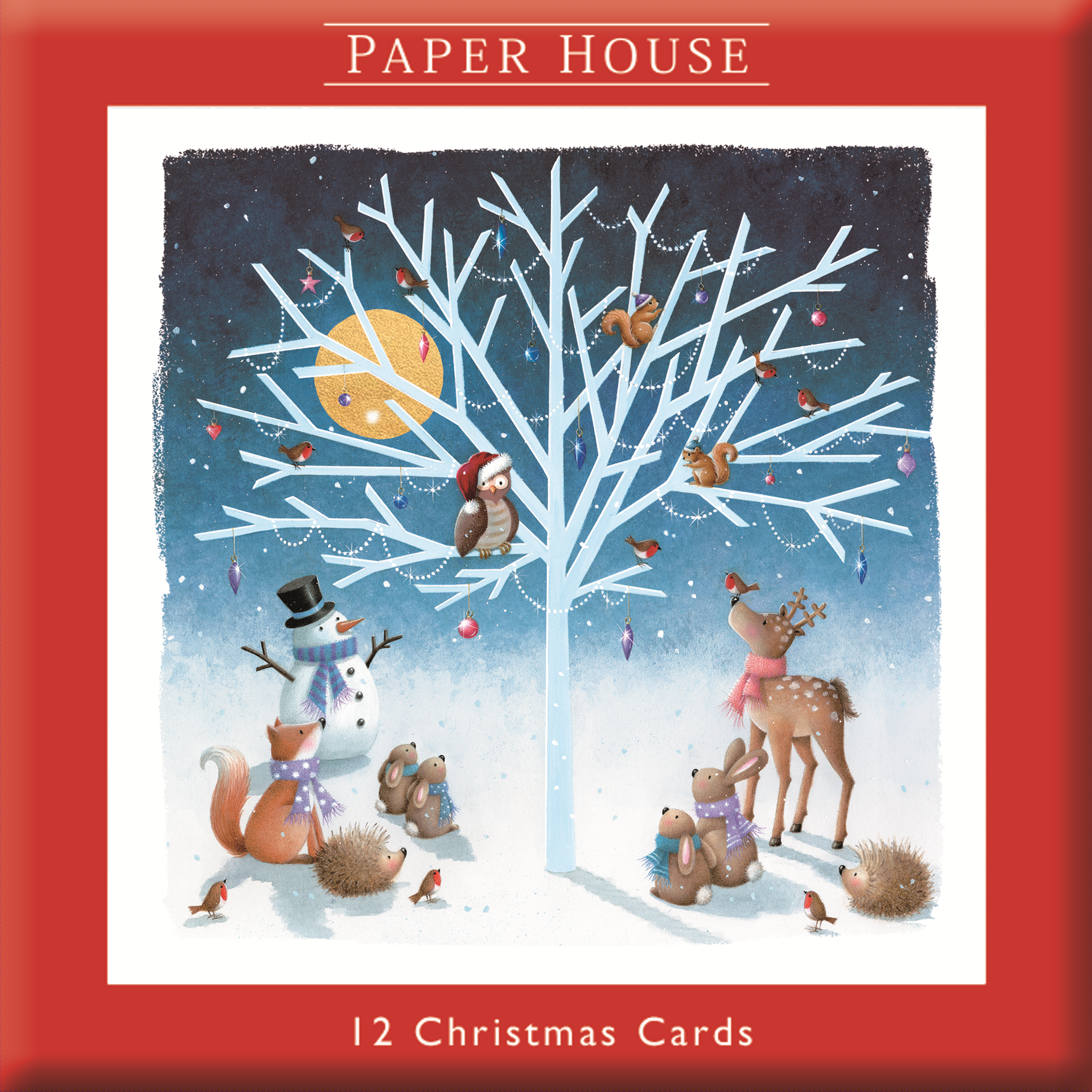 Details: Inside each box of Christmas cards are 12 cards in the same design featuring winter festive animals around a tree