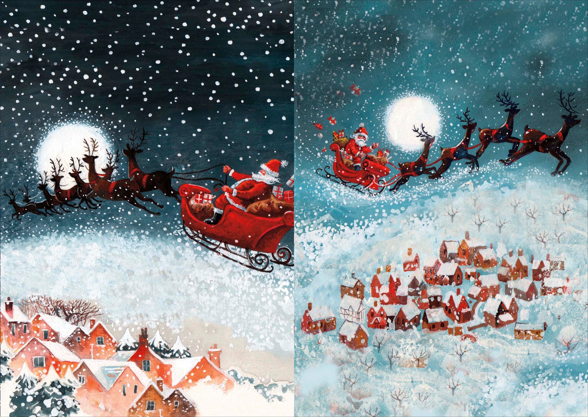 Box Of 12 Santa Flying Over Rooftops Christmas Cards