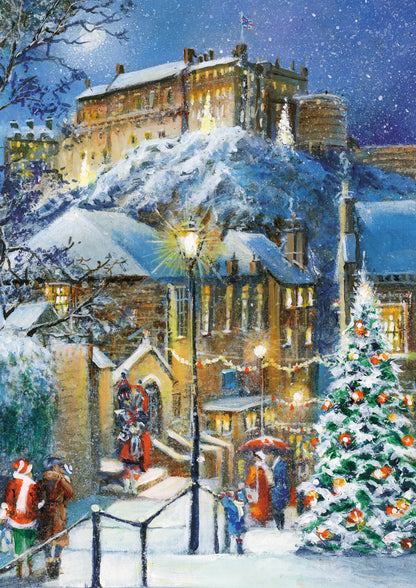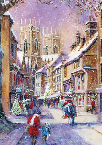 Details: This charitable box of Christmas cards feature snow-covered city scenes at Christmas with the captions 'Christmas Light' , 'Petergate York', 'Hyde Park Skaters' and ''Edinburgh Castle'. Designed by Great British Cards as part of their Charity range.