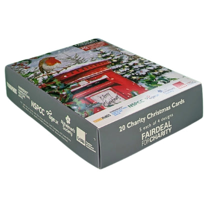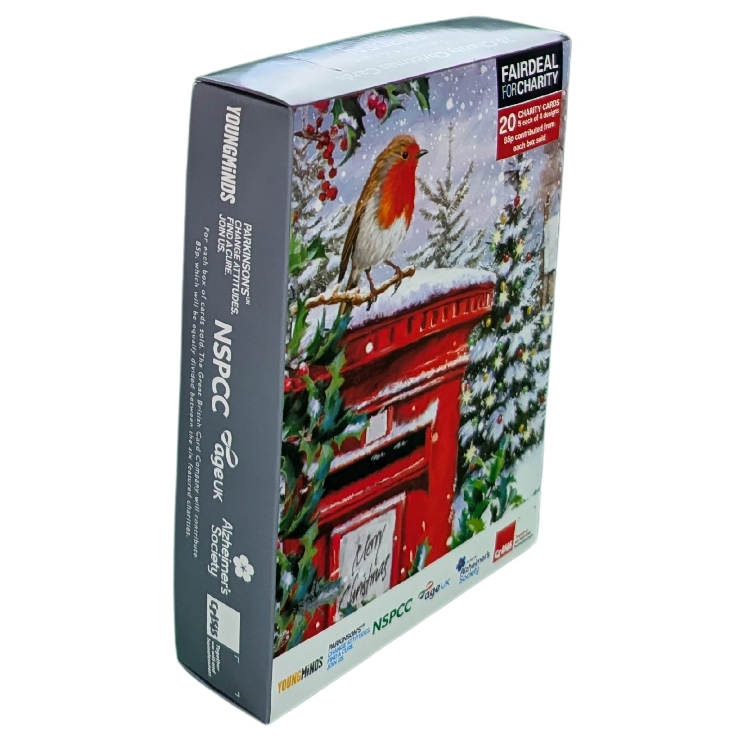 Details: This charitable charity card box features a collection of donkeys, deer, sheep, rabbits, and robins in snowy fields, with the designs 'Robin on Postbox', 'Animal in Farmyard', 'Stags' and 'Donkeys Sheep'. It is thoughtfully designed by Great British Cards as part of their Charity range, sure to bring happiness to someone special.