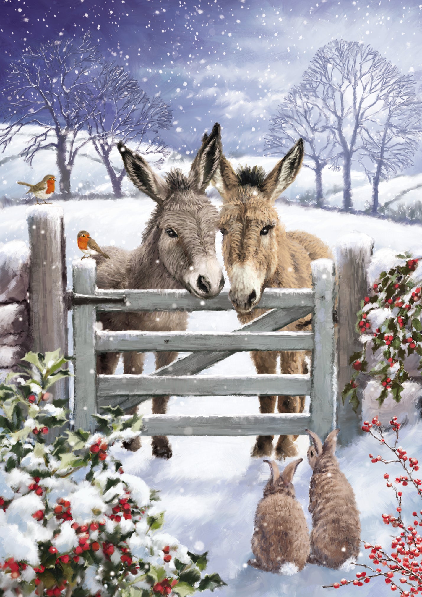 Looking for greeting card ideas for Christmas? Capture the magic of the season with this heartwarming collection of cards, featuring a delightful assortment of donkeys, deer, sheep, rabbits, and robins frolicking in snowy fields. Each card is a perfect way to surprise and delight a special someone, spreading the joy and spirit of Christmas.