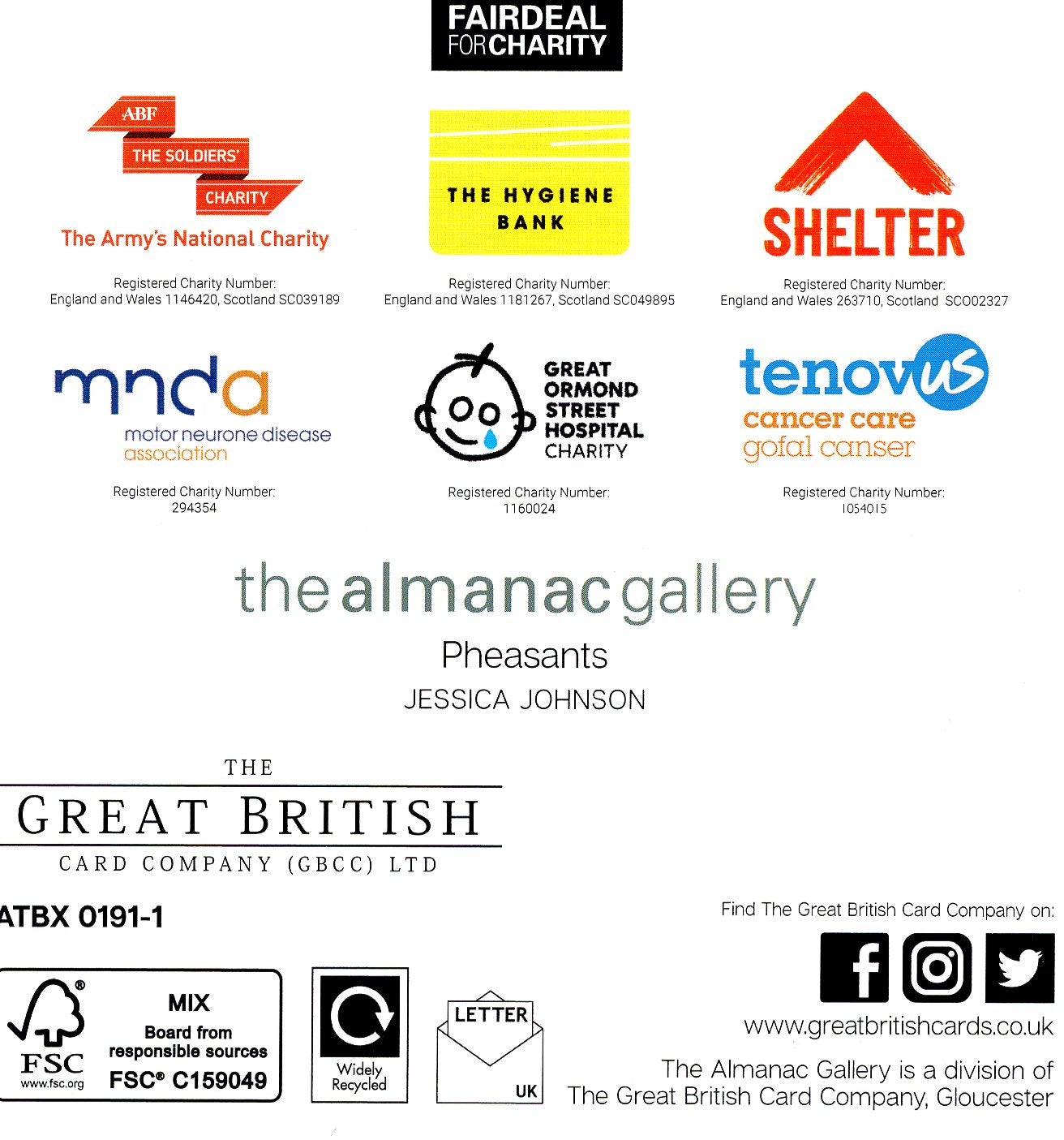 Details: A quality pack of 20 charity cards in two designs of winter scenes and a pheasant in the snow comes complete with white envelopes. Each purchase includes a charity donation of 90p per pack divided equally between Great Ormond Street Hospital Charity, The Soldiers' Charity, MNDA Motor Neurone Disease Association, Shelter, Tenovus Cancer Care and The Hygiene Bank supporting Hygiene Poverty.