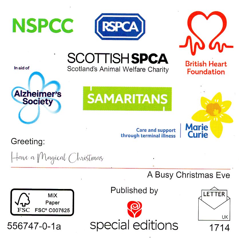 Details: A cube of 30 mini Christmas cards in four designs complete with white envelopes. Each purchase includes a charity donation of 35p per pack divided equally between the Samaritans, Marie Curie, RSPCA, British Heart Foundation, NSPCC and the Alzheimer's Society.