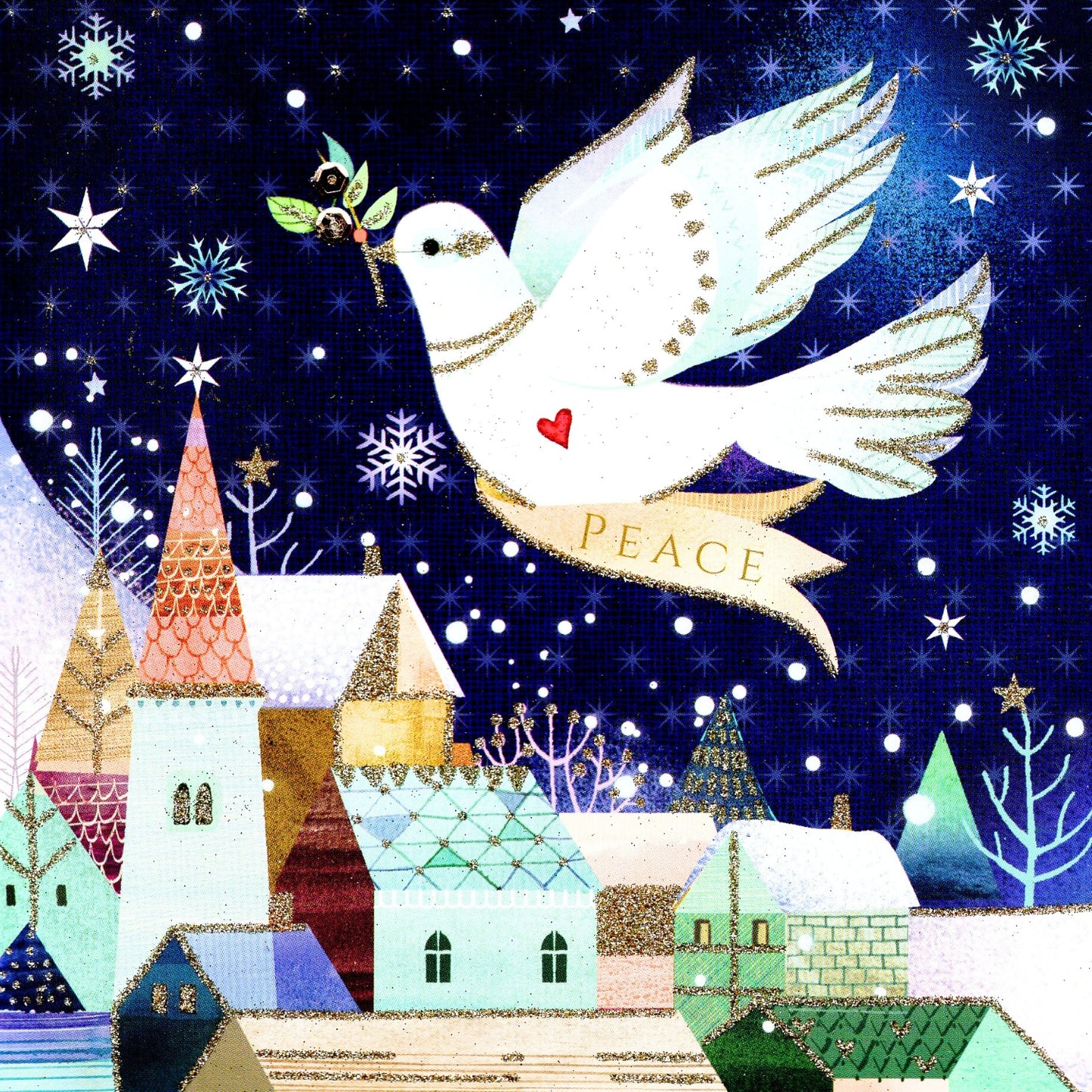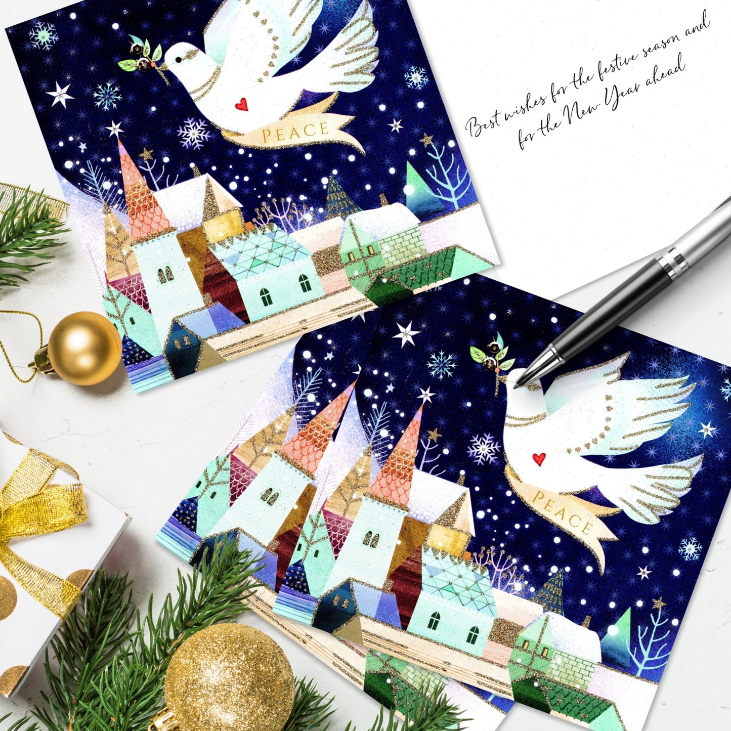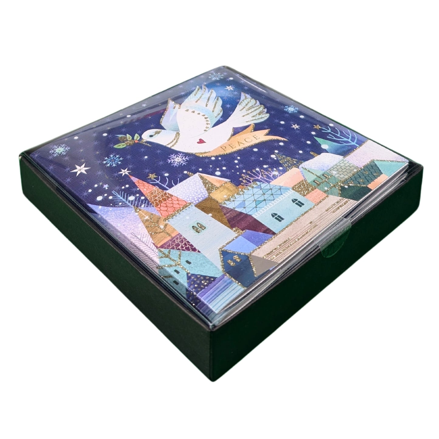 Details: A stunning box of 6 matching hand-finished Christmas cards from Second Nature featuring a dove flying over a snowy village with a festive glitter finish and individual embellishments