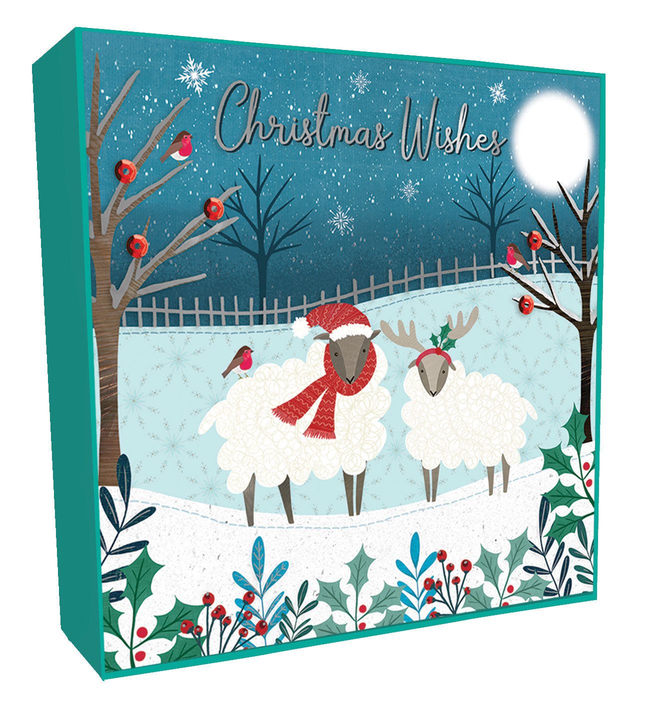 Details: A luxury box of 6 matching hand-finished Christmas cards from Second Nature's Sparke range, each card is foil finished and hand decorated with embellishments and the design features Sheep