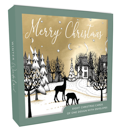 Details: This box of Christmas cards from Second Nature's Winter Wonderland collection showcases a stunning golden winter scene with reindeers in the snow and the caption 'Merry Christmas'.