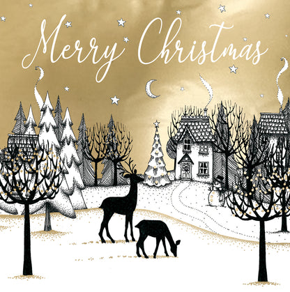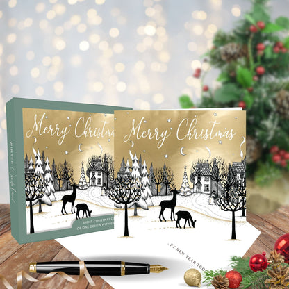 Looking for boxes of Christmas cards? This exquisite and unique box of cards feature a golden winter scene with graceful reindeers in the snow, evoking memories of cosy nights by the fire. Surprise someone special with the magic of Christmas and let them know how much you care with each beautiful card.