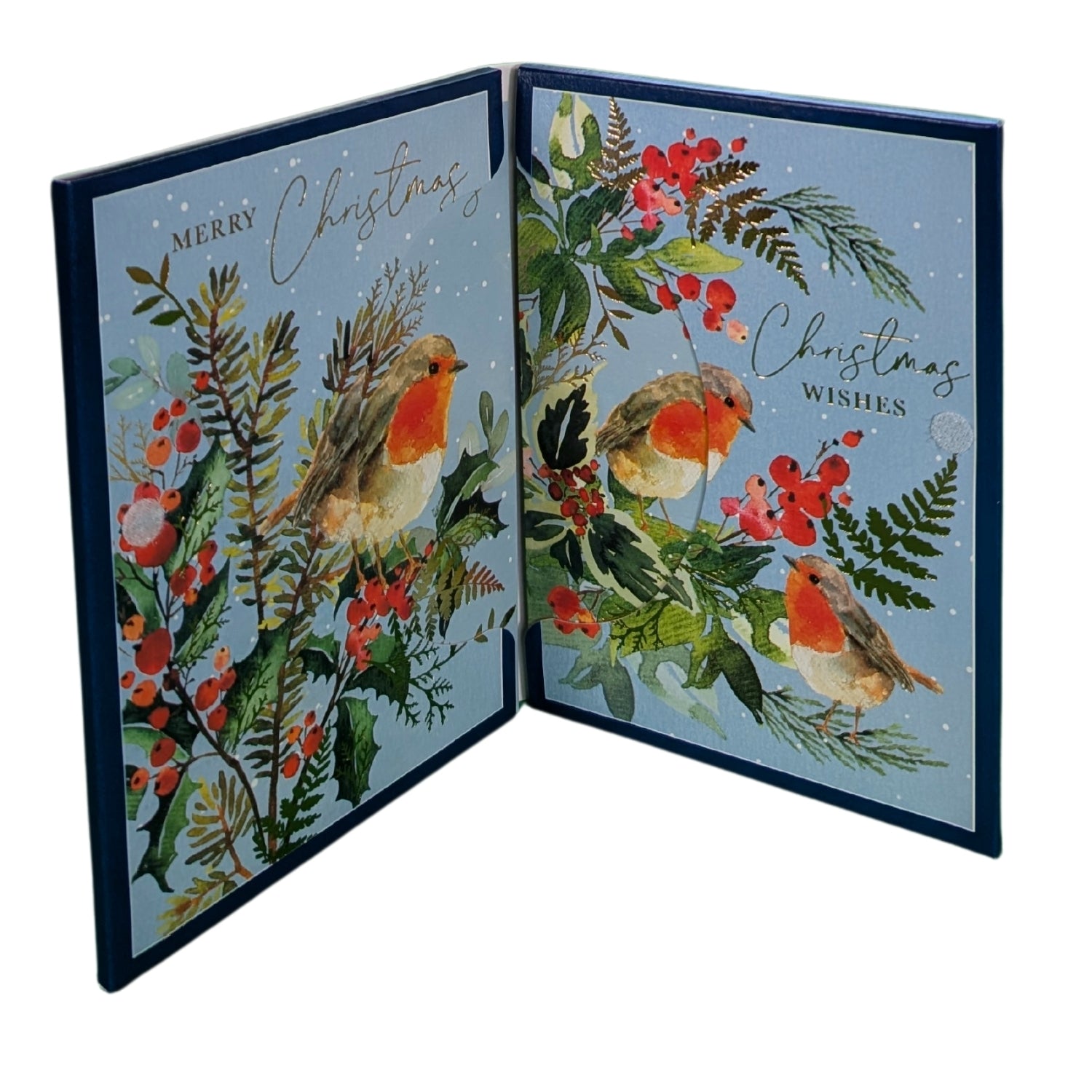 Details: A beautifully crafted eco-friendly box of cards from Paper House's range, showcasing artistic red robins resting on gold, green, and red floral arrangements. The intricate designs 'Robin on Holly Branch' and 'Robin Couple on Holly Branch' are thoughtful send for someone special this Christmas.
