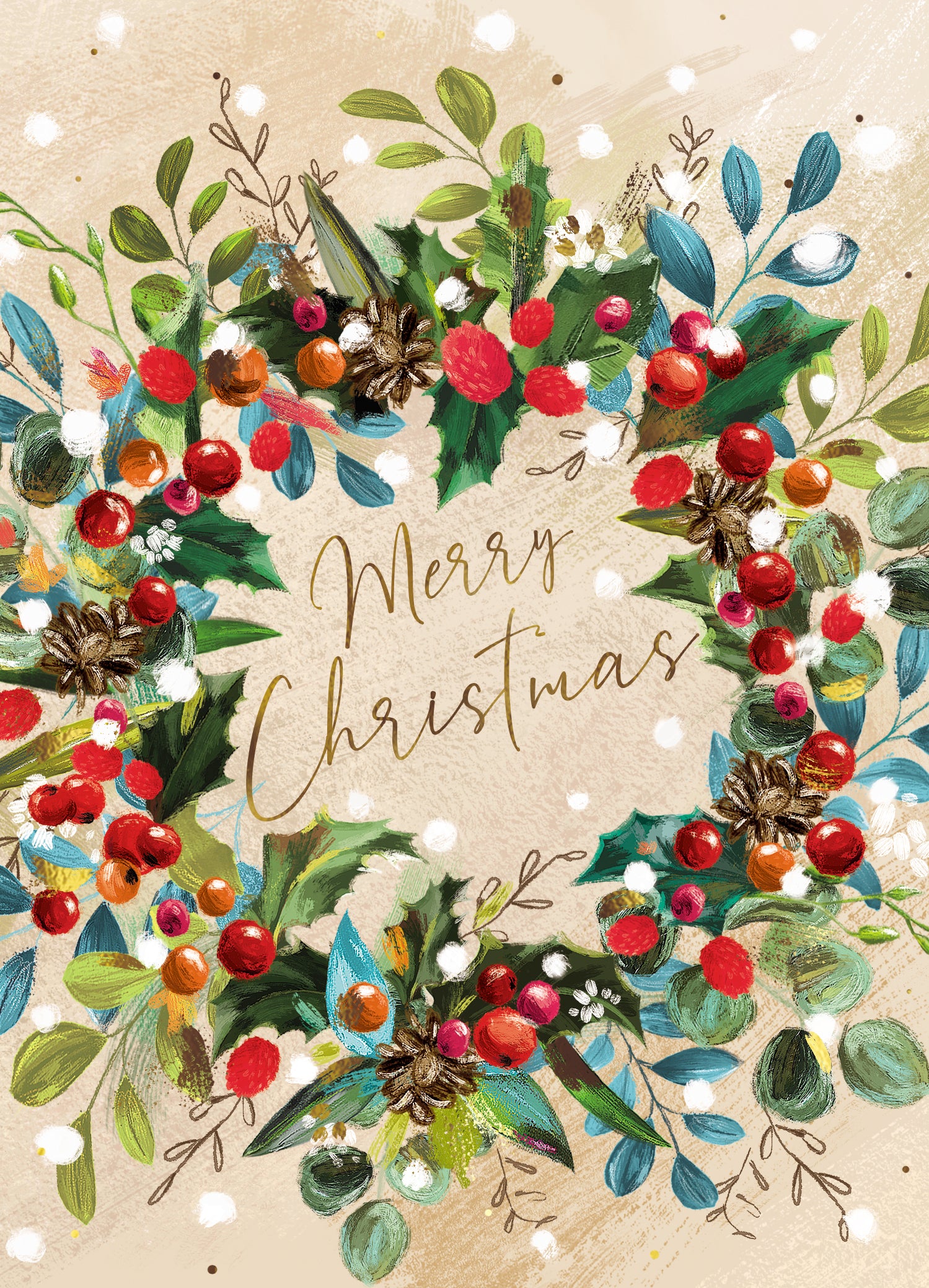 Looking for greeting card ideas for Christmas? Capture the essence of a winter wonderland with stunning floral wreaths and snow sprinkled across each card. Share the magic of the season with loved ones through this eco-friendly greeting card.