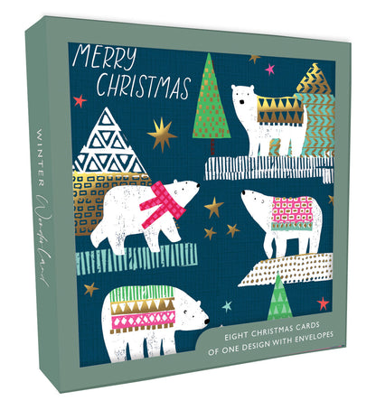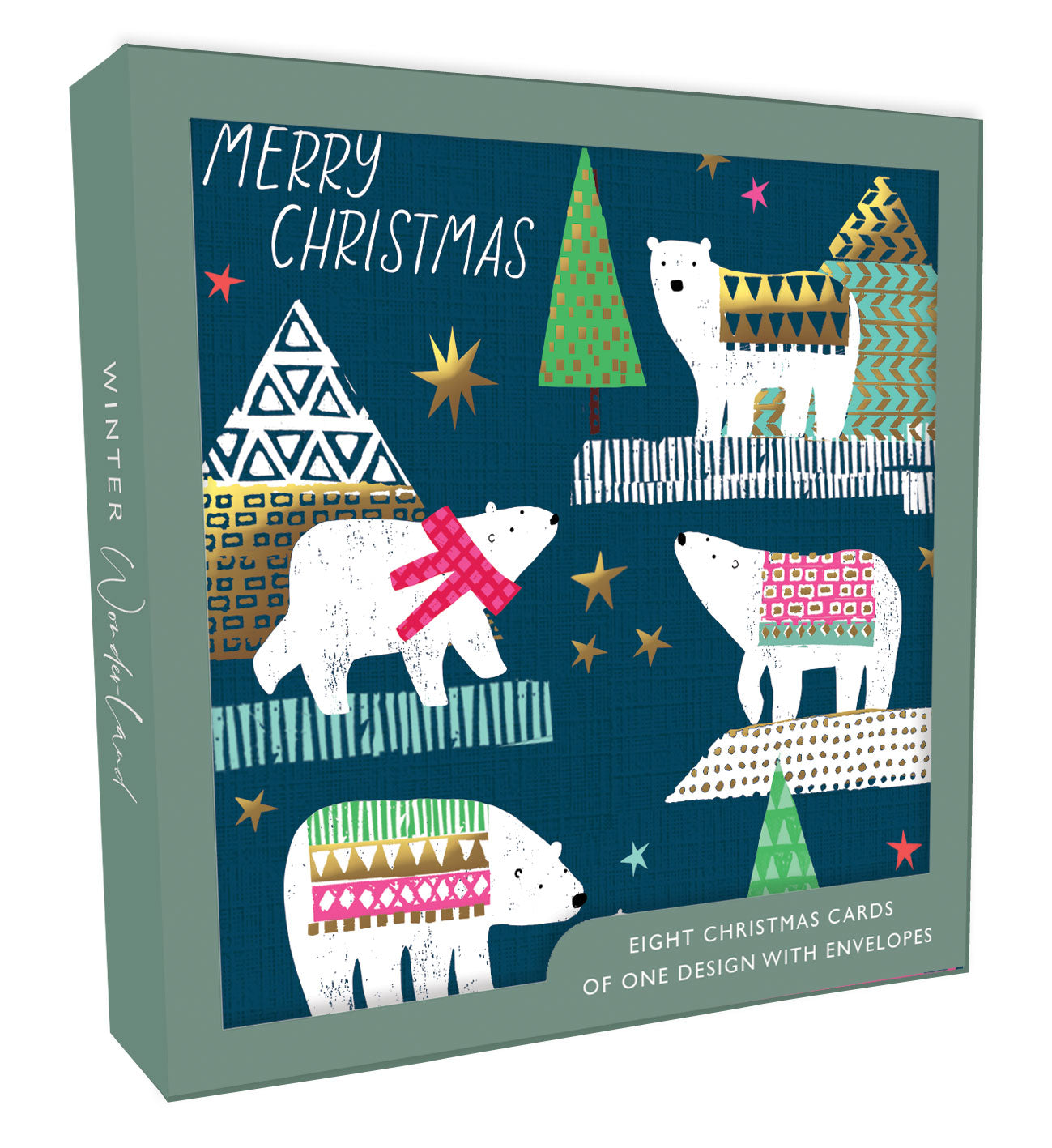 Details: A luxury box of 8 matching foiled Christmas cards from Second Nature's Winter Wonderland range, each card is foil finished and the design features Polar Bears