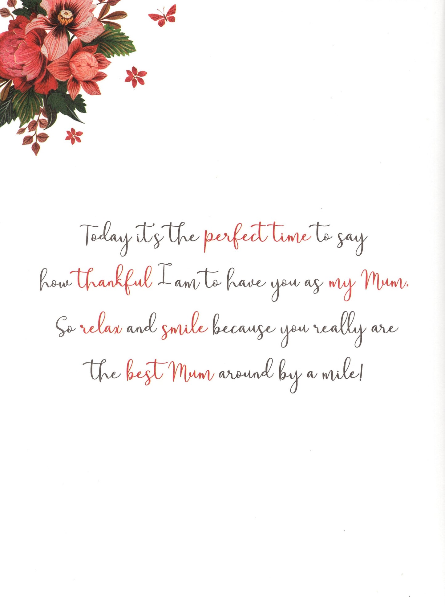 Message: You're the kind of Mum who listens and who always understands, you always know what to say and are there with a helping hand. Today it's the perfect time to say how thankful i am to have you as my Mum. So relax and smile because you really are the best Mum around by a mile! Happy Mother's Day