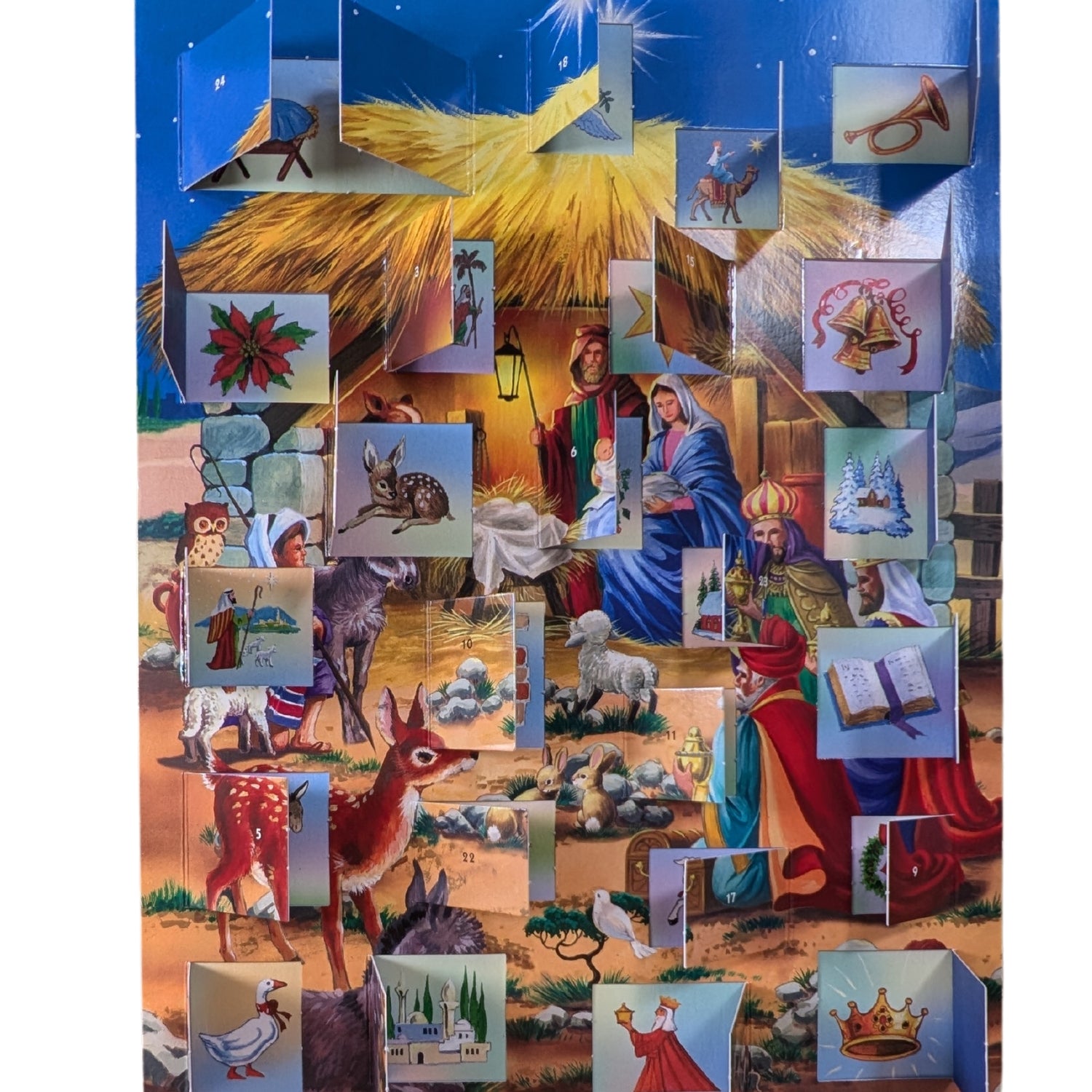 Details: A traditional Christmas advent calendar complete with 24 doors to open during the countdown to Christmas, each revealing a festive picture