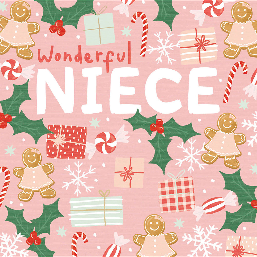 Shopping for a cute Christmas card for a special Niece? This playful gingerbread and candy cane design is the perfect way to add a girly touch to your Happy Christmas wishes
