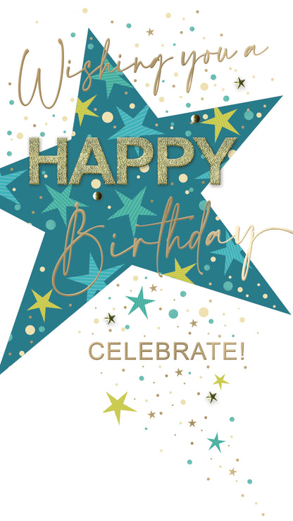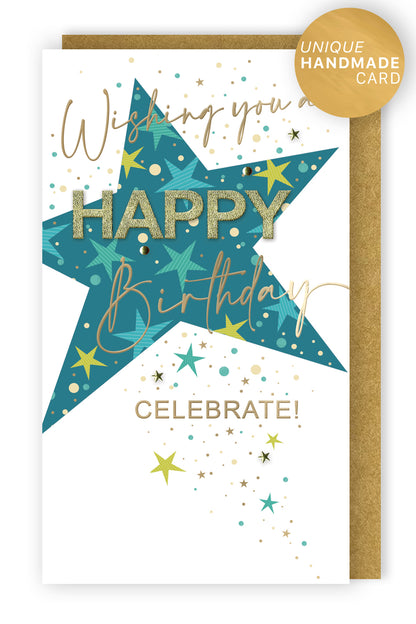 Looking for greeting card ideas for someone special? The Celebrate Happy Birthday Sparkle-tastic Surprise Hand-Finished Birthday Card is a beautiful way to show someone you care. Its masculine design, with a blue star and gold birthday text, is perfect for surprising a special someone. It captures the essence of love and celebration in a heartfelt way.