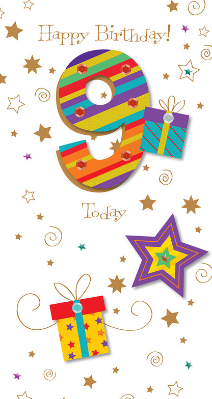 Looking for birthday card ideas for children? This fun embellished card is covered in stars and golden touches to make the birthday boy or girl feel special on their 9th birthday.