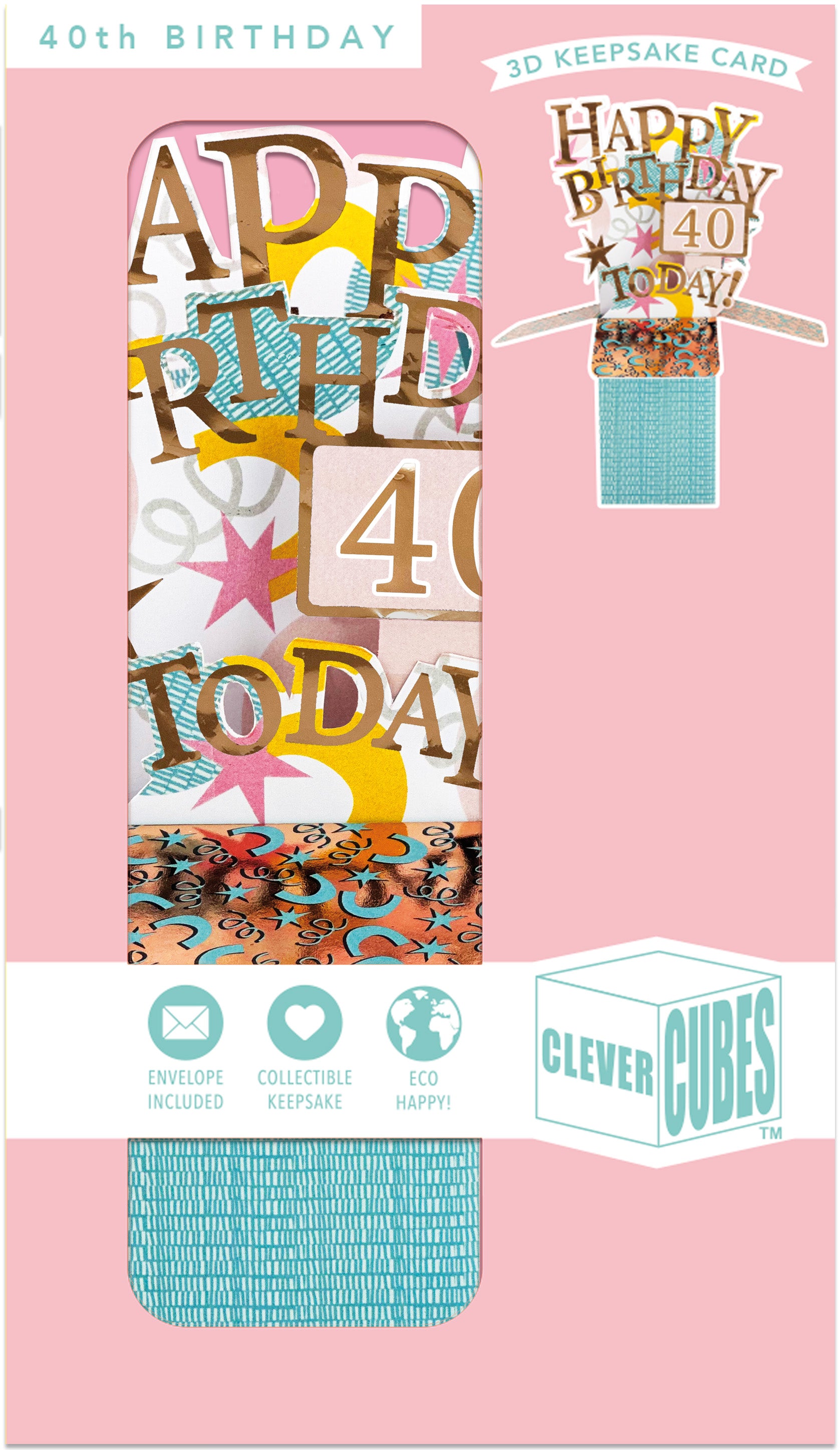 Details: Celebrate a special lady's milestone birthday with the Clever Cubes range pop-up card from Second Nature. The card features a fun 40th birthday message and a cleverly designed pop-up element when opened. Make someone feel extra special with this thoughtful and unique birthday card.