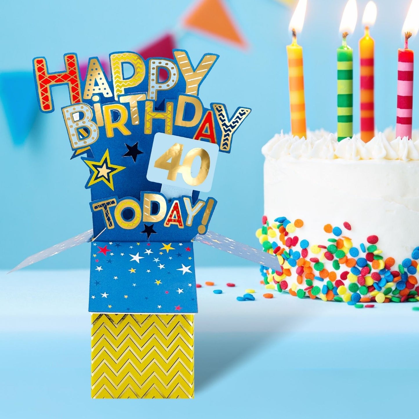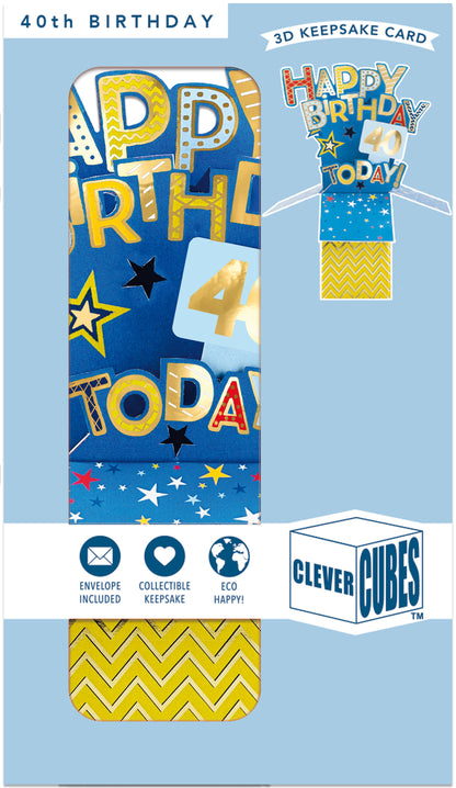 Details: This colourful pop-up card is part of Second Nature's Clever Cubes range. The blue-tastic design features 40th birthday wishes and the caption "Happy Birthday 40 Today!" This thoughtful card is sure to make a special someone's birthday even more special.