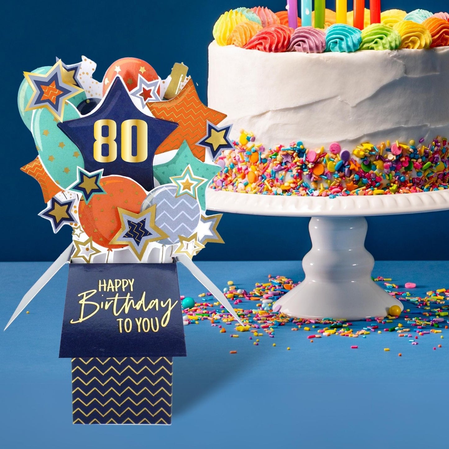 Looking for greeting card ideas for him? Celebrate your loved one's milestone with a stunning pop up greeting card filled with festive 80th birthday balloons, champagne bottles, and confetti. The perfect way to show them how much they mean to you in a simple yet stylish way.