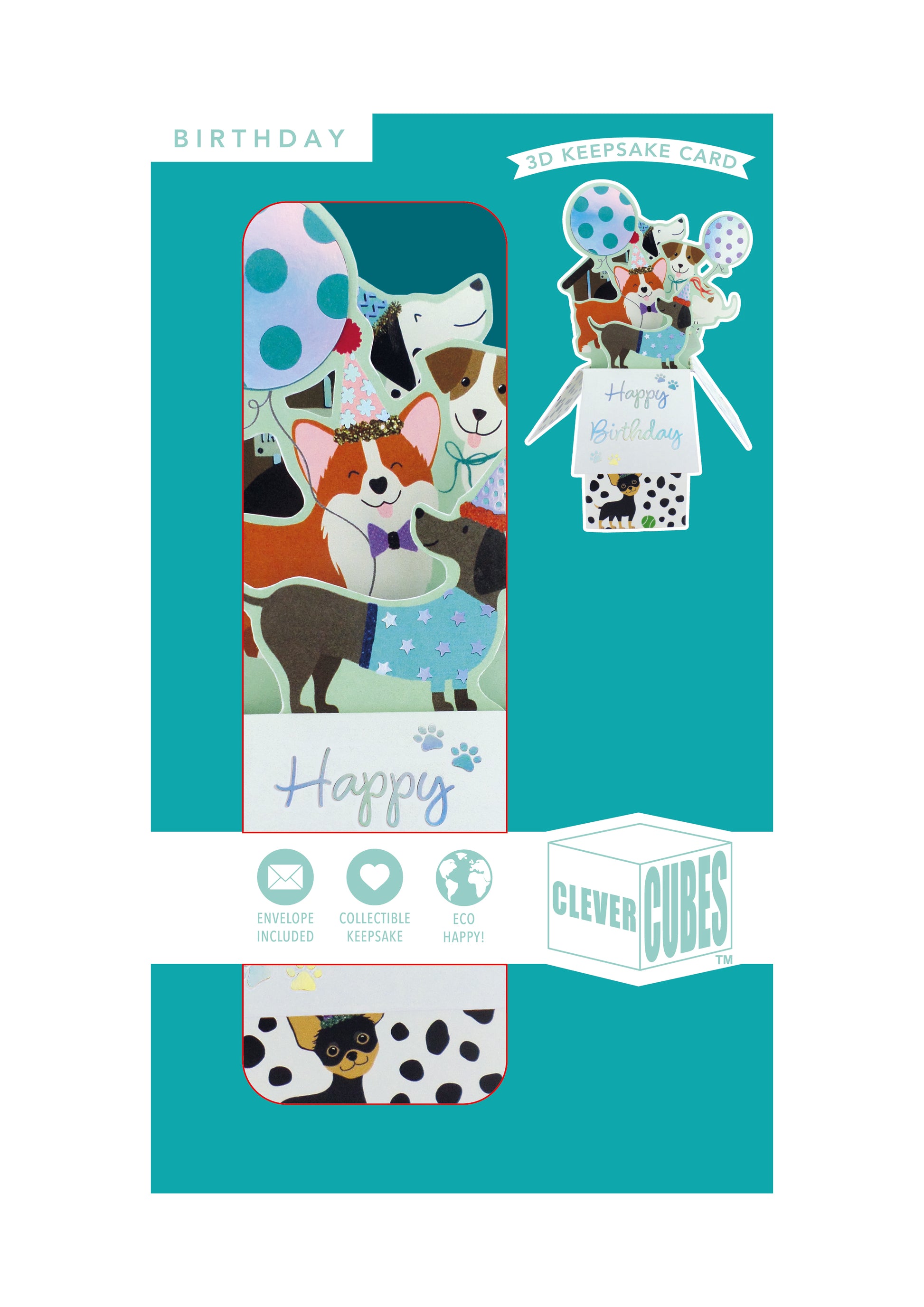 Details: This pop-up card from Second Nature's Clever Cubes line depicts a playful group of party hat-wearing dogs celebrating with the words "Happy Birthday." Its thoughtful design is sure to bring joy to anyone who receives it.
