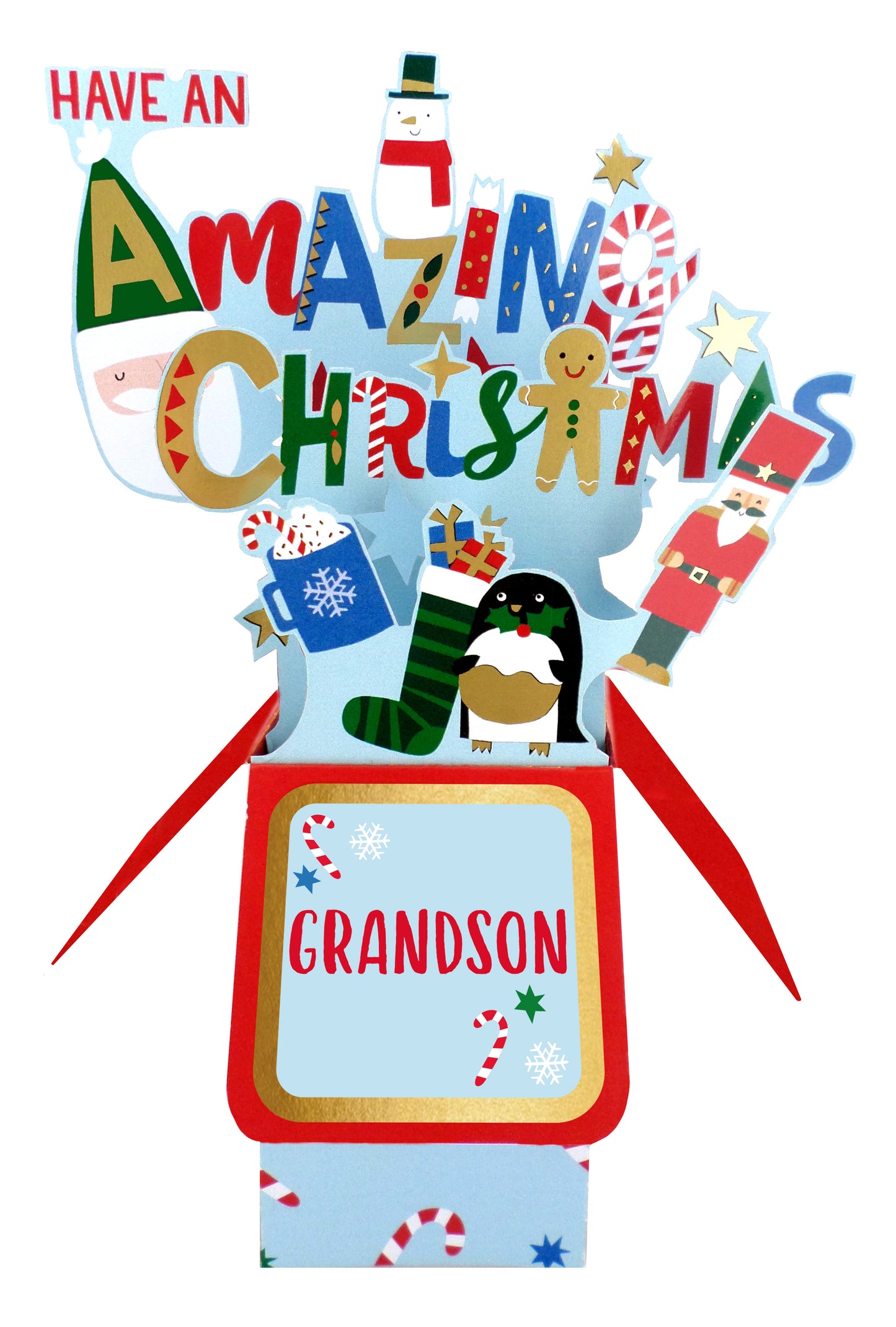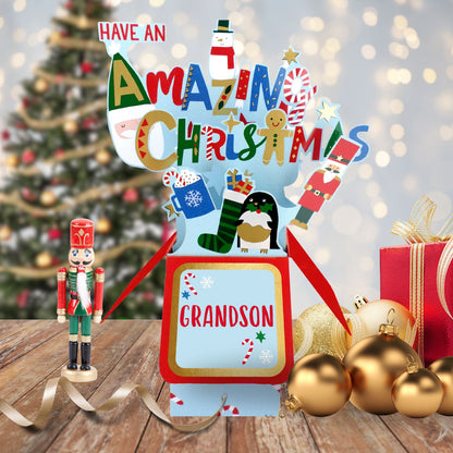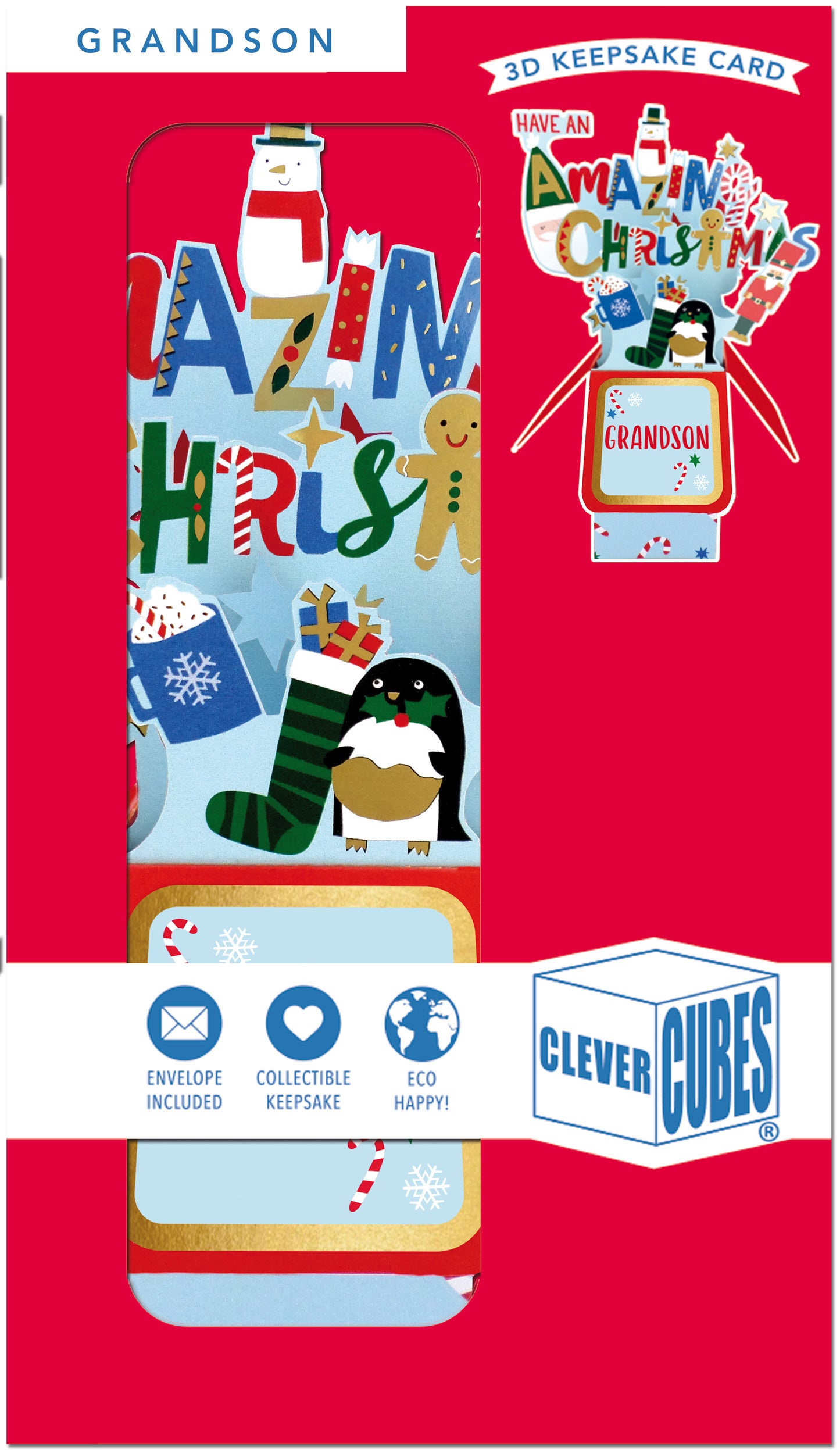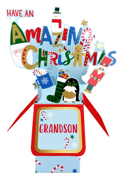Details: This Christmas pop-up greeting card from Second Nature's Clever Cubes range features a festive snowman, Santa, and penguin, with the caption 'Have an Amazing Christmas Grandson'.
