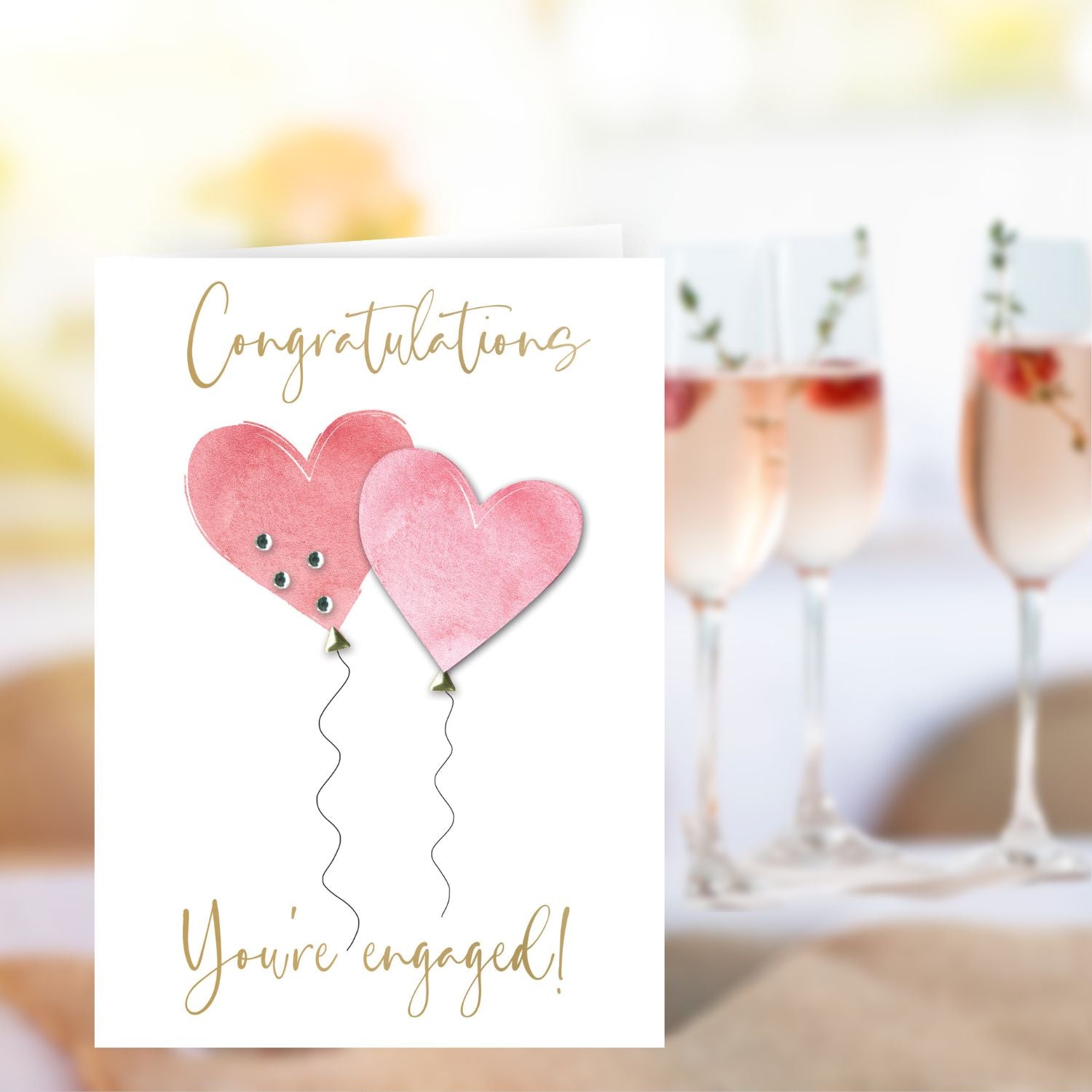 Looking for greeting card ideas for an newly engaged couple? Receiving this handmade greeting card with pink heart balloons will fill their heart with joy, capturing the excitement and love of their engagement. It's a heartfelt surprise that shows you care.